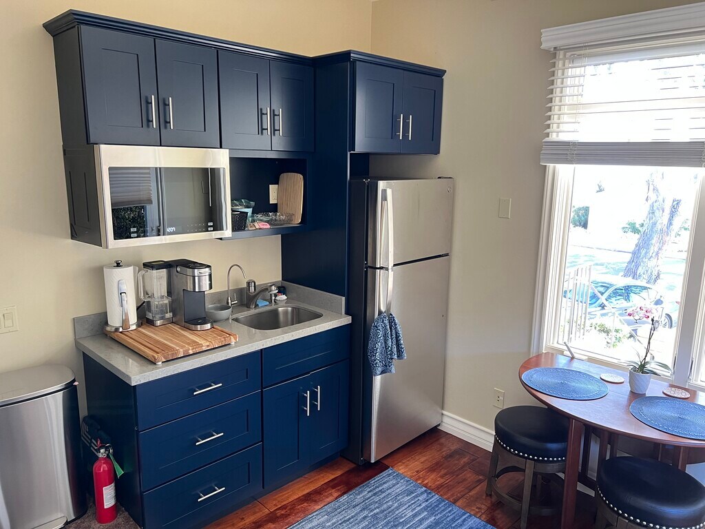Available January 1, 2026 - The furnished apartment is part of the owner-occupied house but entirely private. The main house and apartment are separated by a hallway door which is locked on both sides for security. Utilities, water, trash and internet are included in the rent. The property is a newly remodeled four-bedroom, three-bathroom home done in a modern Santa Barbara Craftsmen style with an ocean view. The private accommodations were expanded in 2022 to feature a small front room with ocean view. The front room has a kitchen including small countertop with cooktop, toaster oven, sink, garbage disposal, coffee maker, microwave, pure drinking water faucet from undercounter RO system and full-size refrigerator/freezer with ice maker. Full kitchen supplies such as dishes, pots and pans and utensils are provided. There is a dining table with stools and small sofa for relaxing. Adjacent to the front room is the private bedroom that features a queen size bed, large flat screen TV with Roku, YouTubeTV and ample storage in a large dresser, two nightstands and closet with shelves and hanging space. The bedroom is nicely appointed with high-end bedding, furniture, and digital clock radio. The bathroom is finished with Italian tile and custom glass tile highlights. An iron and ironing board are provided. The property is landscaped, and the backyard offers a table, fire pit and sitting area for guests to relax in the evening.