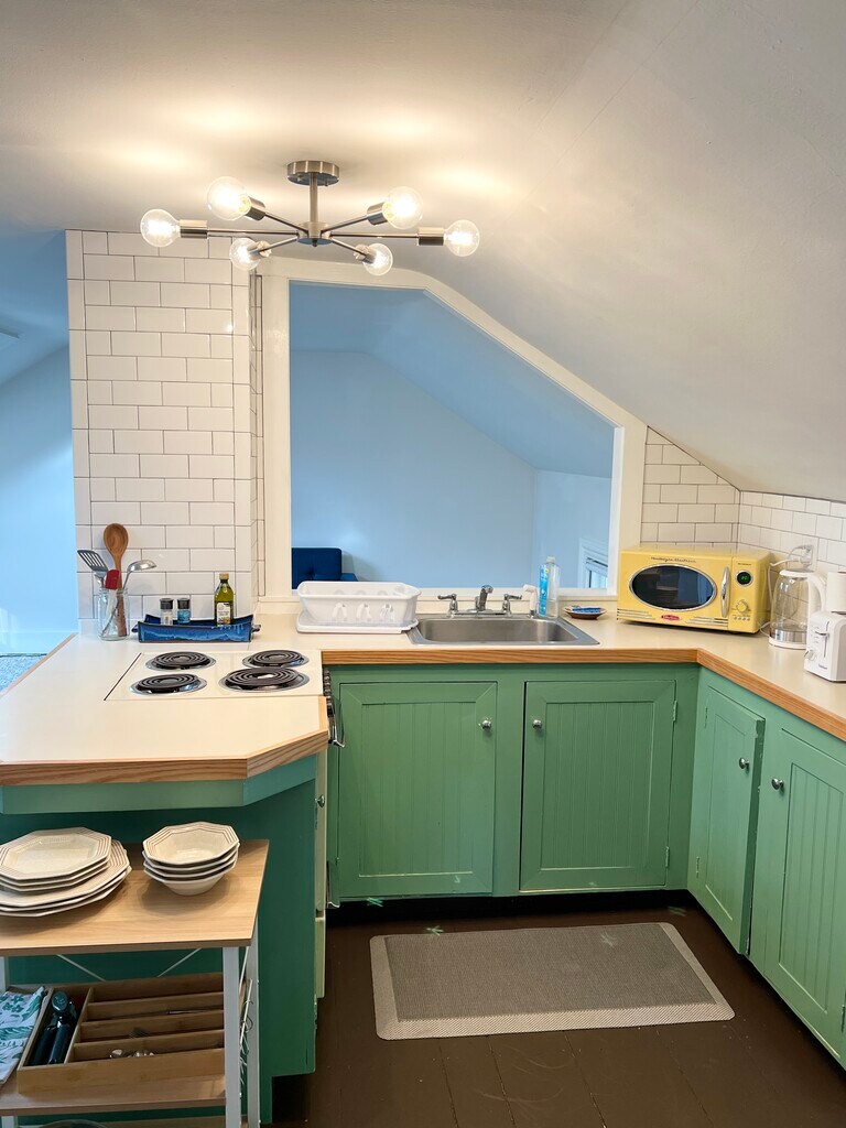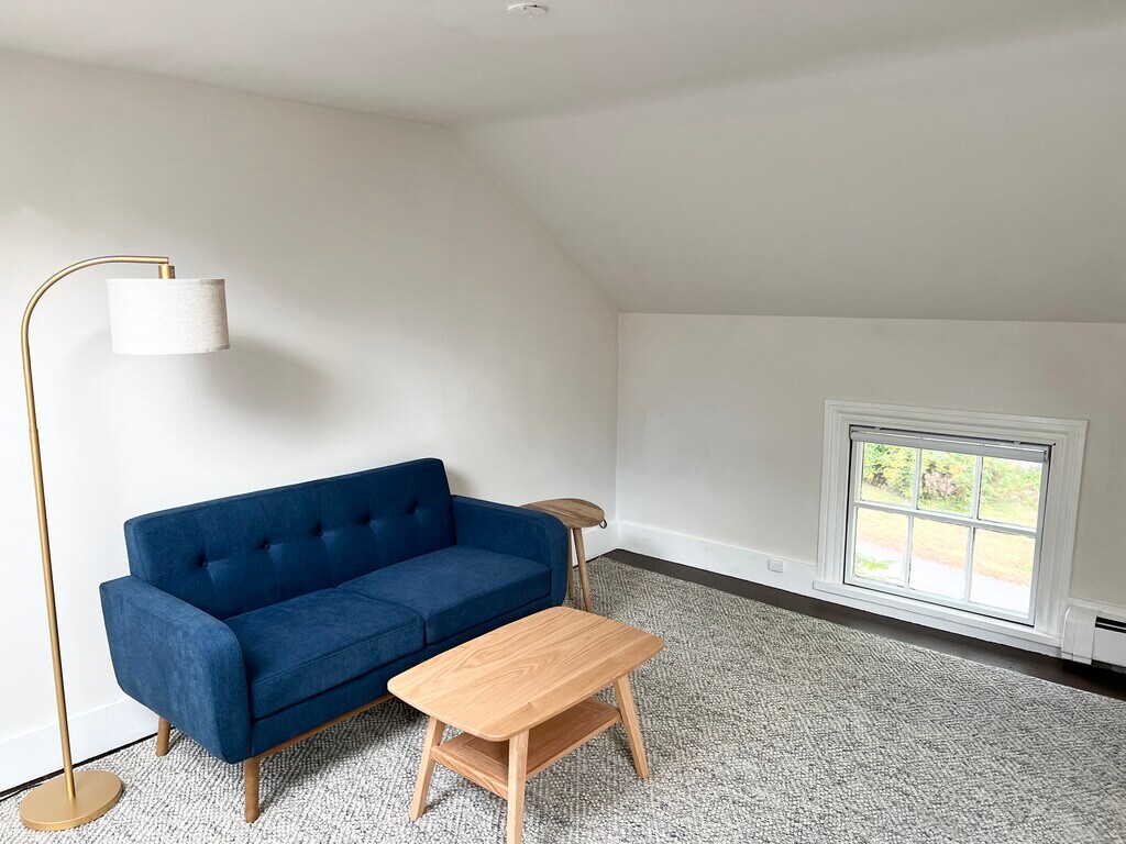 Bright and airy 1 bedroom apartment located in the lovely town of Belfast Maine. This is a second floor apartment with a private entrance. Our primary residence is on the first floor as well as a seasonal carriage house rental. The house was built in the 1860's. We have a dog that you will see occasionally in the backyard as well as our 2 yr old. The apartment has a well equipped kitchen, walk in shower, skylights in the living room/kitchen, and new furnishings. There is storage space and room for some personal small furniture/belongings. There is a separate entrance in the back for the tenant as well as off street parking. It has very nice natural light, overlooks the garden, and is located in a friendly, residential neighborhood.