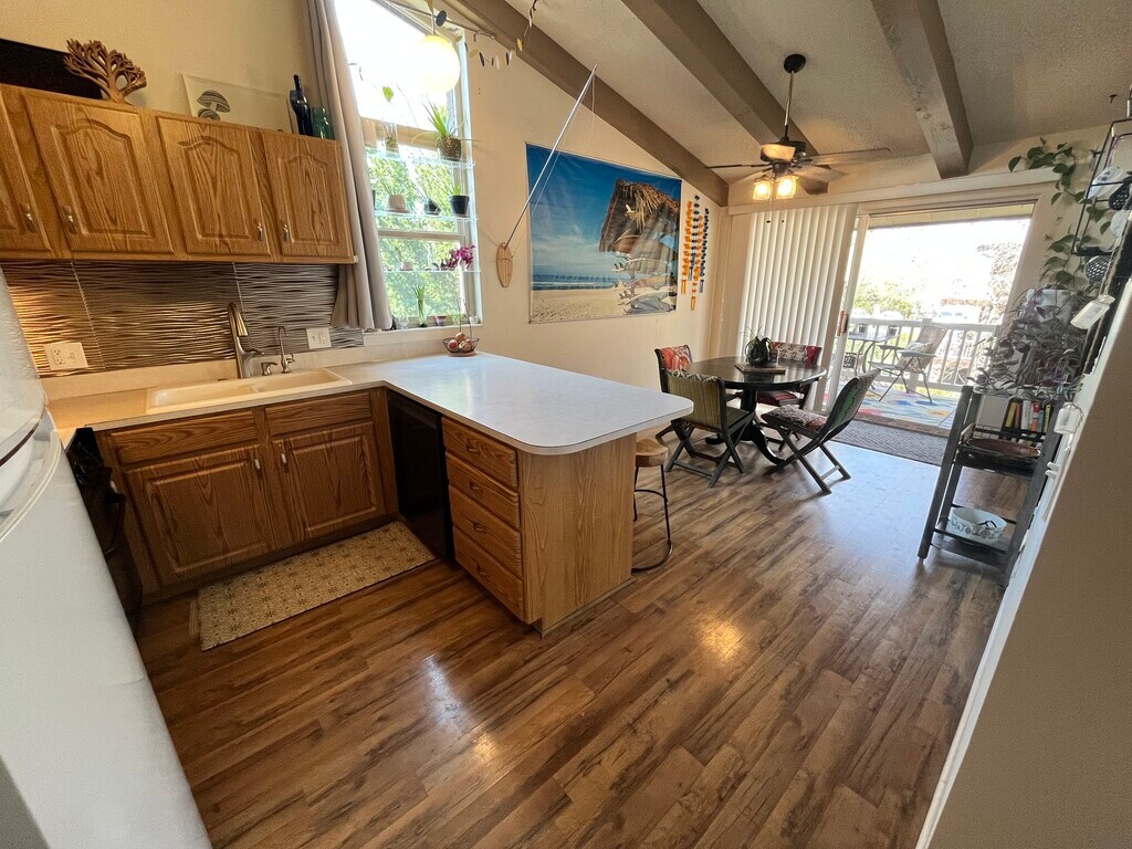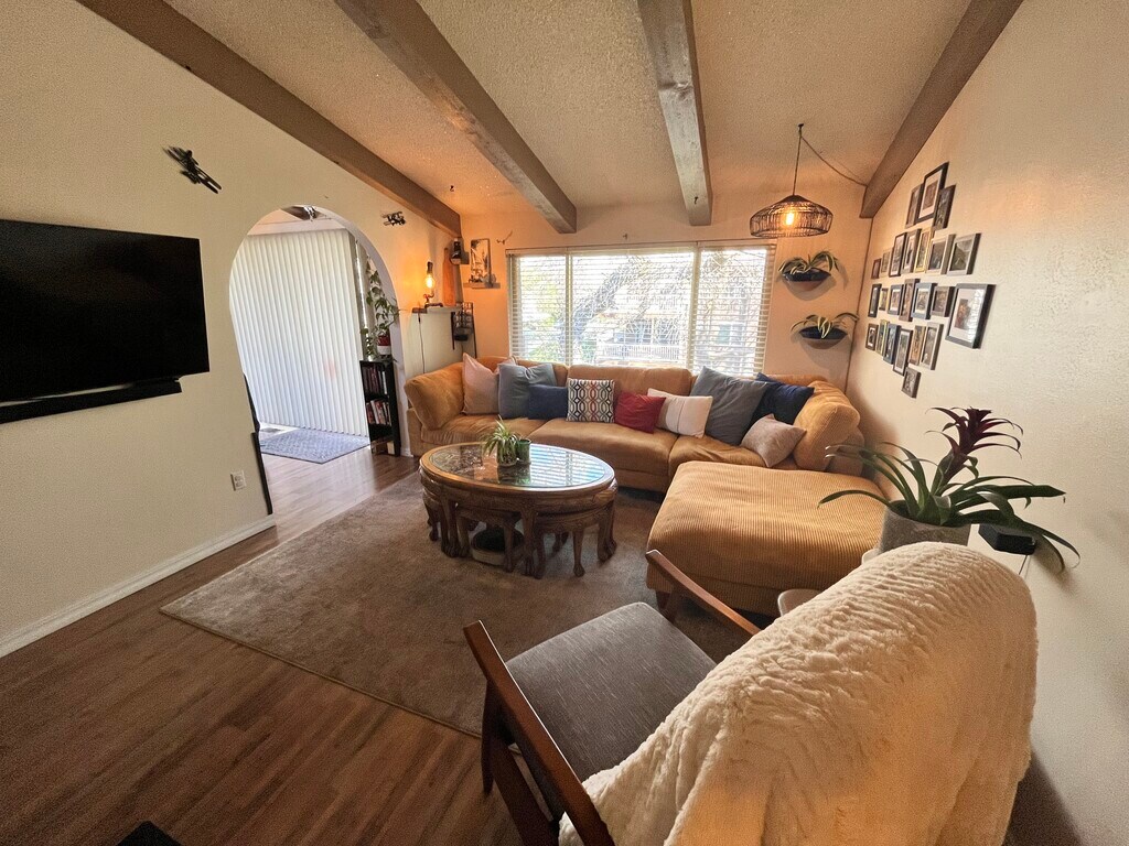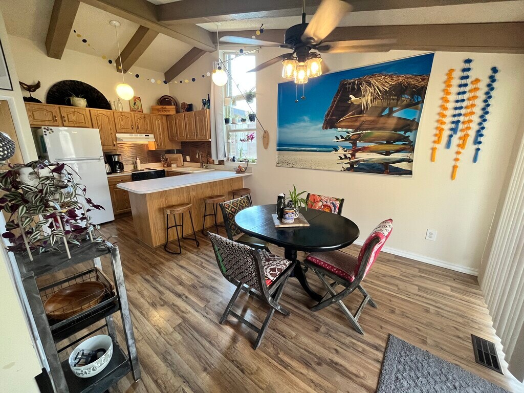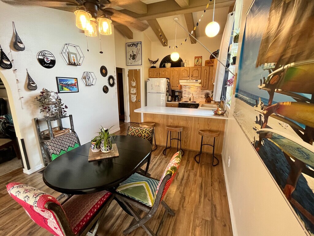 This retro-chic home blends vintage style with modern comfort; think exposed beam ceilings, a cool 1970s fireplace, and elegant arched entryways. Perfect for two, with room for a third, it features a deluxe king bed and a trundle that converts into another king. Step onto the spacious patio, where string lights twinkle overhead and a cozy swing invites you to unwind. Surrounded by trees, it's the perfect spot for sunset dinners and laid-back lounging. *Please note: service dogs only - HOA rule :( Cats are okay.