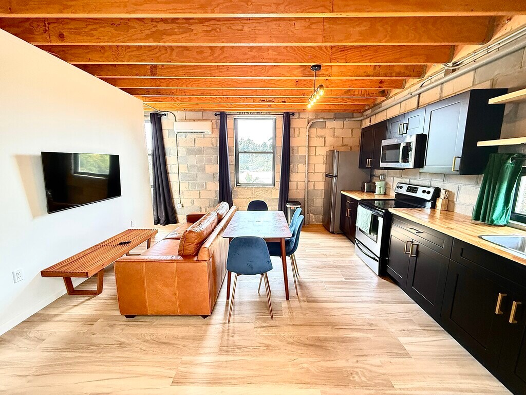 Industrial rustic build. Fully furnished.one bedroom one bath full kitchen king size bed everything included water electric Wi-Fi landscaping. Sits on two acre property close to Downtown West Palm Beach 5 minutes to airport 8 minutes to beaches. Available for 3, 6, 9, 12 months. All utilities and Wifi included. There is only 1 parking spot for this unit. Sorry no Pets.