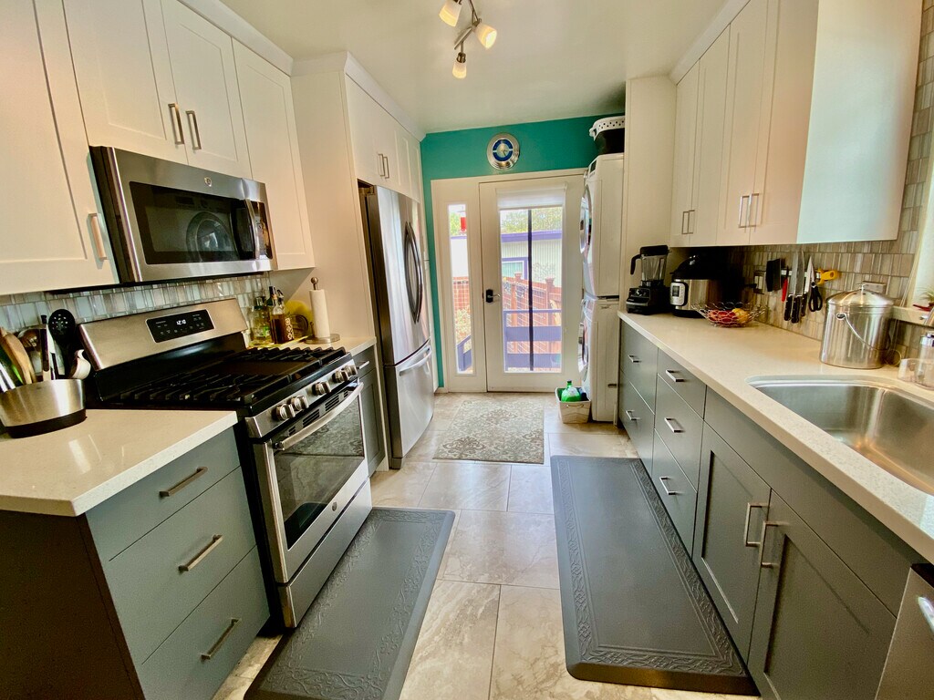 Available for a 1-year lease starting July 1, this deluxe 2 bedroom, 1 bath unit with private patio/garden is in a desirable, quiet neighborhood. This home is located in easy walking distance to North Berkeley BART station, Monterey Market, Berkeley Natural Foods, Acme Bakery, 3 coffee shops, and the Ohlone Greenway walking/running/biking path. The home has a private fenced patio with seating area, garden (w/drip irrigation), and propane BBQ for your exclusive use. The recently remodeled kitchen opens to the living room with a bar and seating area which makes a great workspace. The kitchen has a dishwasher, full size front-loading washer and dryer, large french door refrigerator w/ice maker, microwave, and a gas stove/oven. The main bedroom has a very large closet, and the window opens to the backyard (so no street noise). The bathroom has a shower/tub with good water pressure and on-demand hot water. The second bedroom is perfect for an office and the living room has a wall-mounted TV. Free street parking is available in front of the duplex (plenty available and no permit needed). The rental price includes garbage/recycle, and biweekly bathroom/kitchen cleaning. Tenant covers 2/3 of water/sewer and gas payments, plus $100/mo. for solar electricity and highspeed Wi-Fi. Security deposit is $7500. No Smoking and no pets.