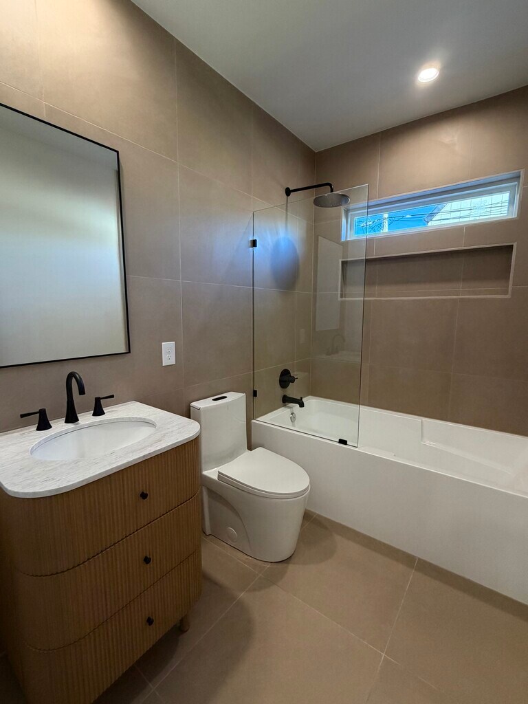Brumbaugh Enterprises presents The Lakeshore House - a completely rehabbed 2-bedroom, 2-bathroom duplex in the heart of Cleveland's Gordon Square Arts District, one of the city's most walkable and vibrant neighborhoods. Every inch of each ~1,200 sq ft unit is brand new: new mechanicals, new electrical, new plumbing, and designer finishes throughout. This isn't a cosmetic flip - it's a full gut rehab done right. The Kitchen & Living Space The open-concept living and kitchen area is bright, modern, and built for real life. Warm wood flat-panel cabinetry pairs with white quartz countertops and backsplash. A full suite of stainless steel appliances is included - French door refrigerator, range, over-range microwave, and dishwasher. Matte black fixtures and hardware throughout give the space a polished, intentional feel. Durable wood-look porcelain tile flooring flows through the entire unit. The Bathrooms The primary bathroom is a showstopper - floor-to-ceiling large-format charcoal tile, frameless walk-in glass shower with rain showerhead, double vanity with white quartz countertop, and dual undermount sinks with matte black faucets. Both bathrooms are fully tiled and beautifully finished. The Bedrooms Both bedrooms are generously sized with ample closet space - plenty of room for a king bed, dresser, and more. Whether you're settling in solo or sharing the space, the layout gives everyone room to breathe. What's Included In-unit LG stacked washer & dryer Central air conditioning & forced air heat Large private outdoor patio with access to a shared back yard - fully fenced for privacy 2 off-street parking spots in a secured, fenced rear lot Smart home integration Water, sewer, trash, and lawn/snow removal included in rent Plenty of storage throughout the unit Lower unit also includes exclusive use of the full basement for additional storage.