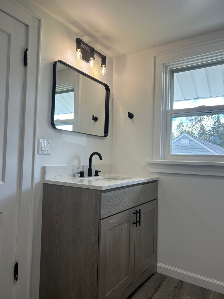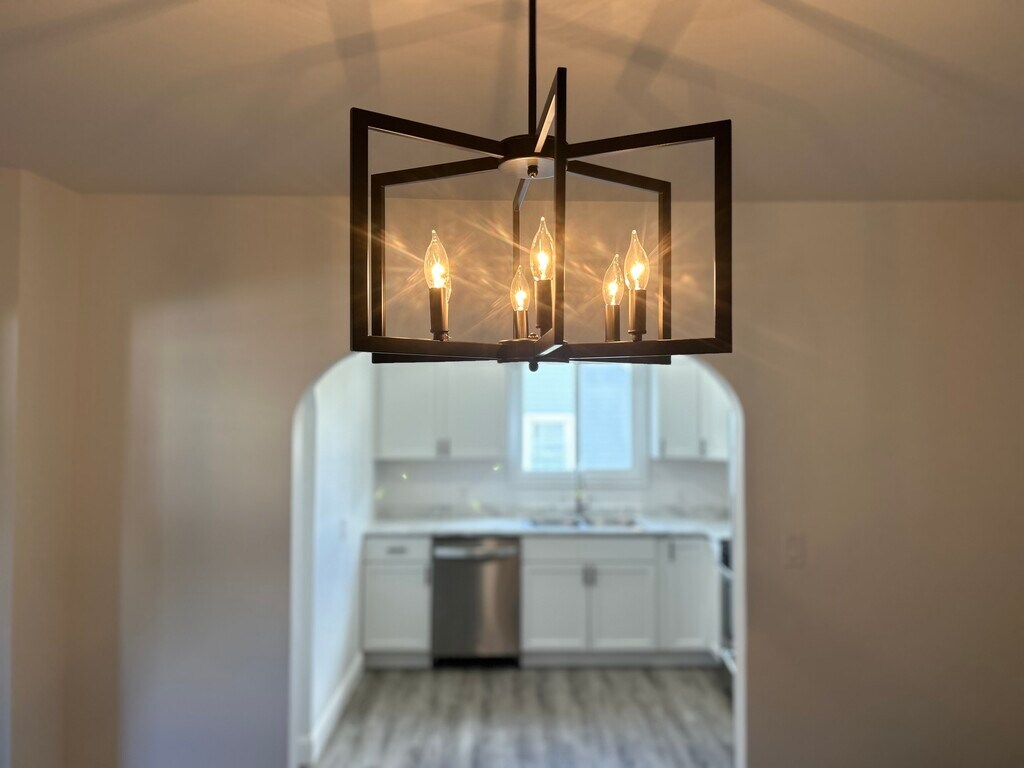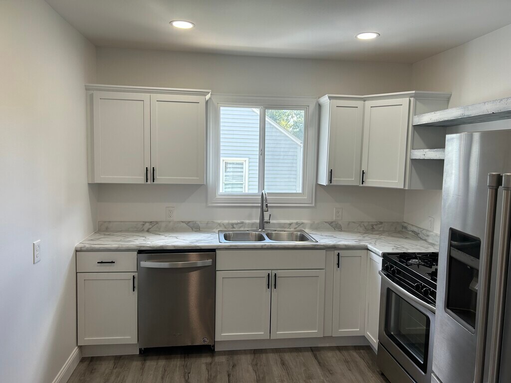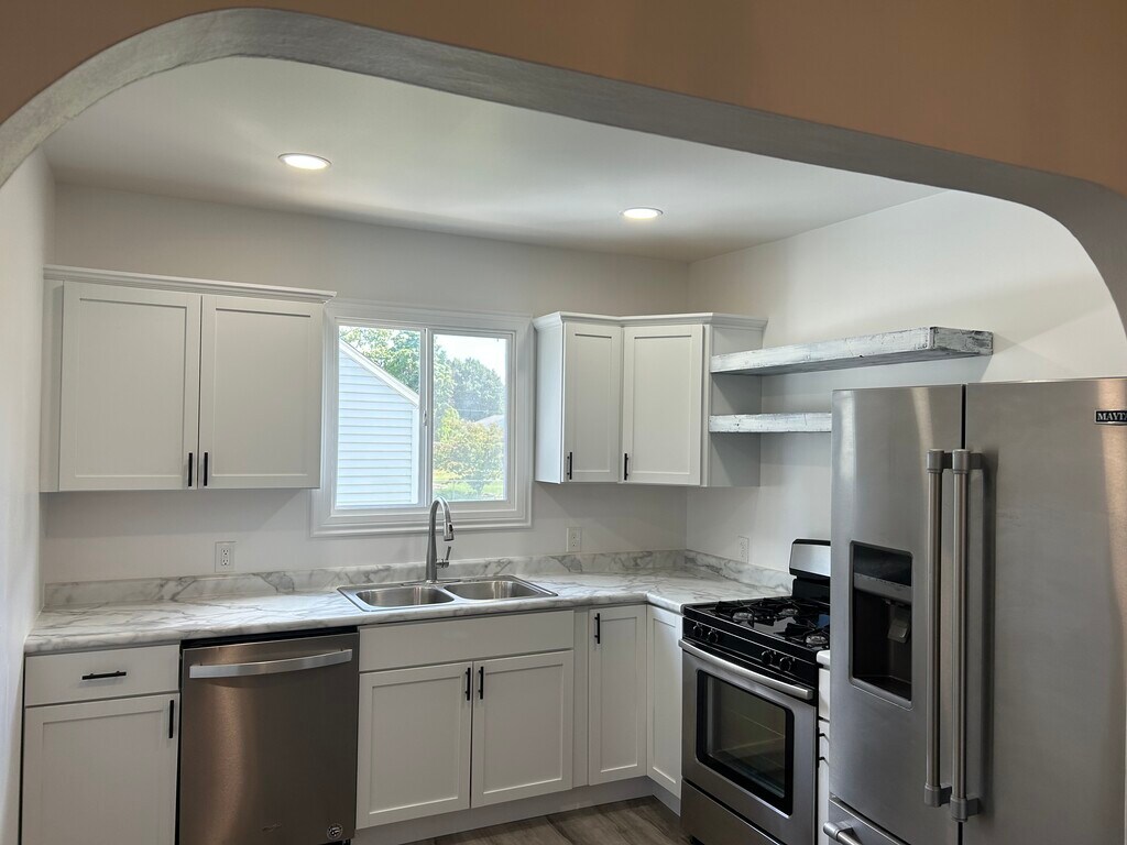 A beautifully updated home that perfectly blends modern finishes with cozy charm. Step inside to find a bright and inviting interior with fresh neutral paint, stylish gray-toned wood-look flooring, and updated lighting throughout. The heart of the home is the fully renovated kitchen, featuring white shaker cabinets with black hardware, marble-look countertops, stainless steel appliances, and a double-basin sink framed by a large window that fills the space with natural light. At this time requesting application prior to showing. One year lease. Tenant is for yard maintenance, snow removal. $1395 plus all utilities