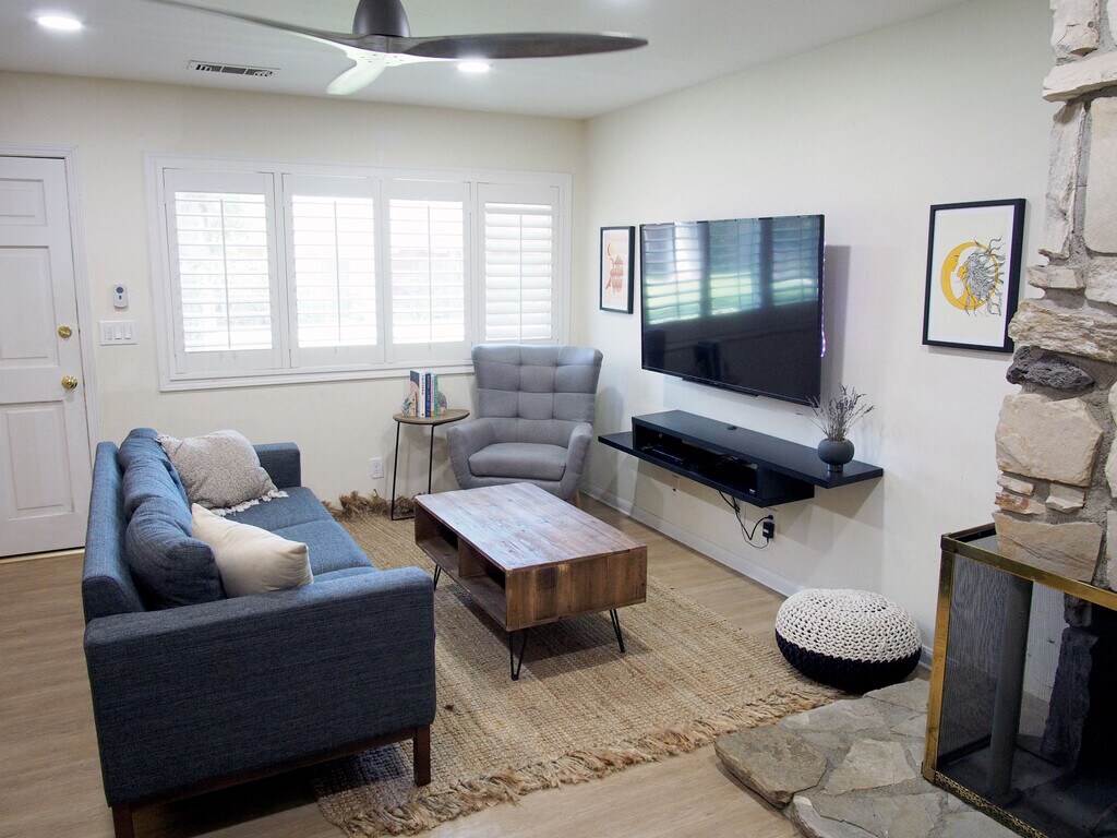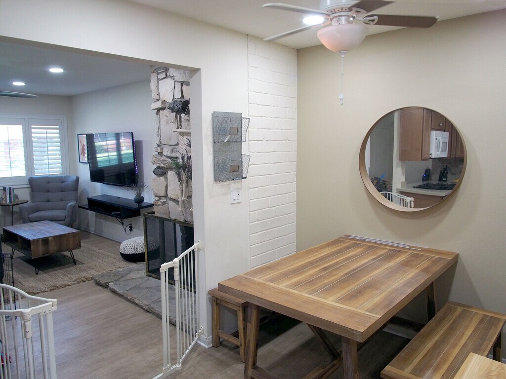 Welcome home to this beautiful condo in the highly sought-after Tustin Villas community. This home has updates throughout. The beautifully manicured landscape welcomes you to this move-in ready 2-bedroom/1.5-bath home featuring an open concept first floor along with two spacious bedrooms upstairs. With double-paned windows, ceiling fans and recessed adjustable lighting throughout the home you can easily make this place your own. The inviting living room features plantation shutters and a gas burning fireplace and beautiful laminate flooring. The living room opens to the kitchen and dining area which features a lot of counterspace, along with a powder room just off of the kitchen. Just outside is a spacious covered patio featuring a laundry closet with a full-sized washer and dryer. Upstairs, the master bedroom features ample closet space, a brand new ceiling fan, and recessed lights. The second bedroom offers a brand new ceiling fan, plantation shutters, recessed lights, and a roomy closet. Enjoy the double vanity in your spacious bathroom along with sliding shower doors. In addition, there is one attached garage and a detached garage steps away. Other highlights include, a new water heater, new dish washer and updated automatic garage doors. The gated, resort-style community offers a clubhouse, gym, pool and BBQs all situated on a lovely greenbelt. The Tustin Villas community is conveniently located a few miles from everything really, namely Disneyland, beaches, Tustin Marketplace and District for shopping, dining, library, and schools.