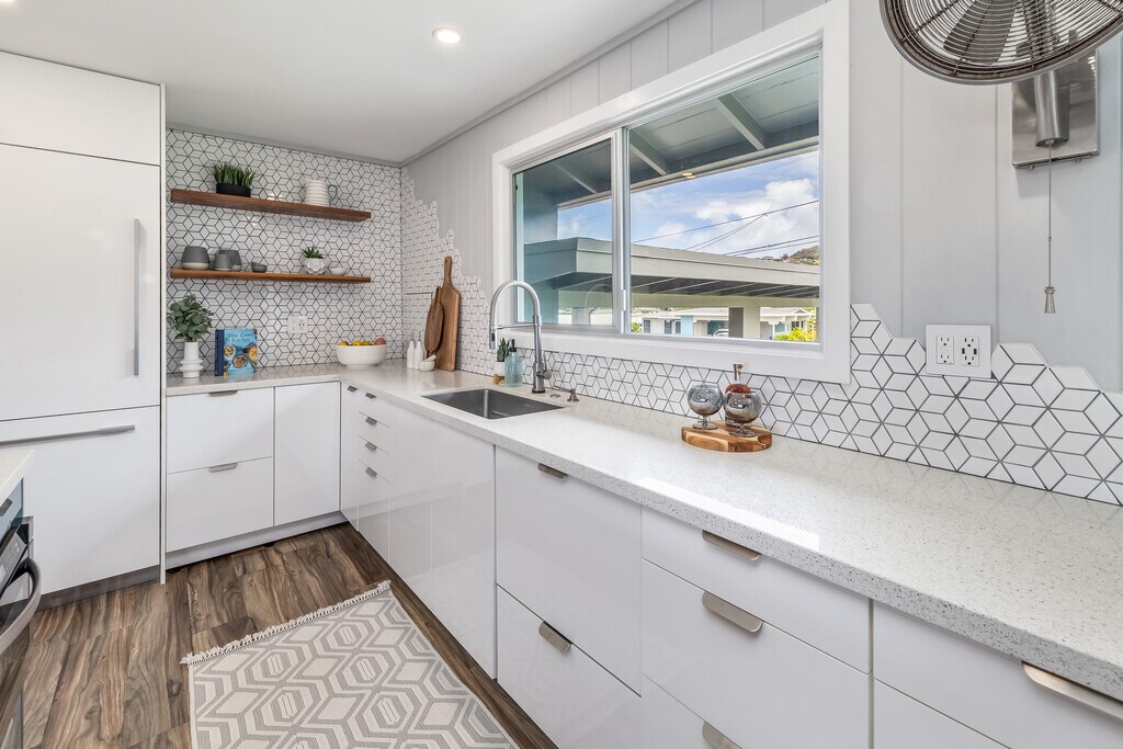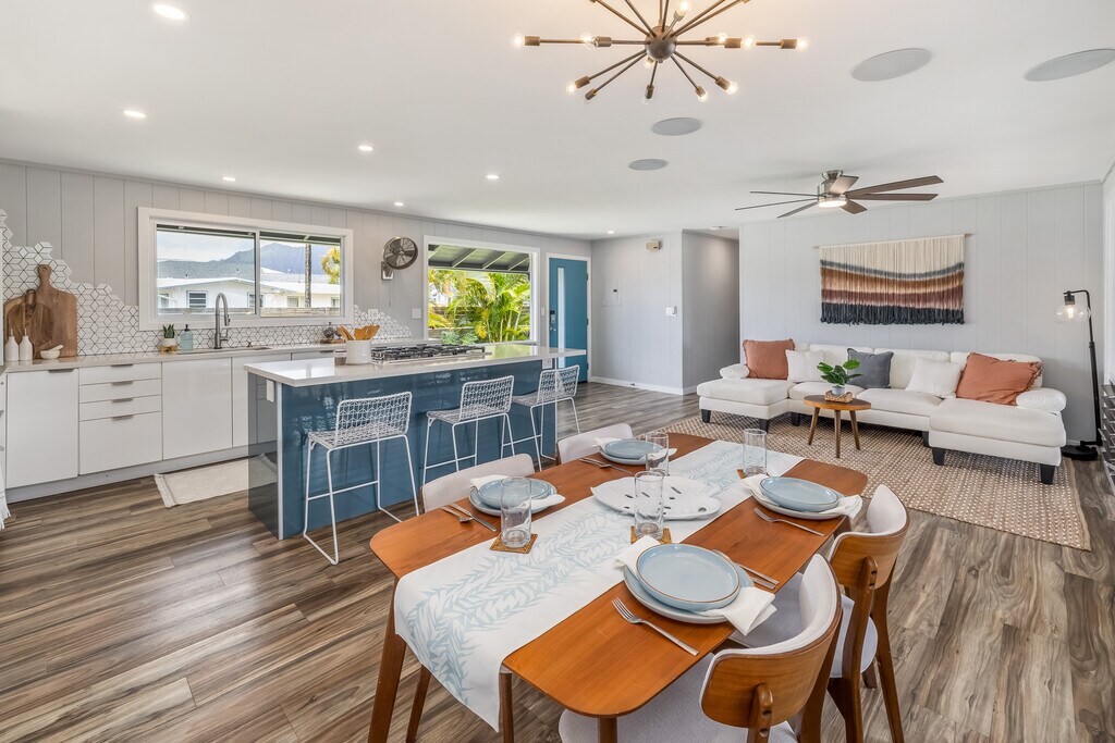 Beautifully remodeled 3-bedroom, 2-bath home with a large screened-in back patio and attached 1-bedroom, 1-bath in-law suite with a private entrance. This modern island-style kitchen features high-gloss cabinets, contemporary appliances, double ovens, and a gas cooktop on a large island. Clean lines and open flow to the dining, living room, and large screened-in back patio, perfect for entertaining. The primary bedroom has pendent lights, a built-in closet organizer, and an ensuite with a luxury shower system. Split AC in every bedroom. Bathrooms are remodeled with stylish tile work, high-gloss cabinets, and a double vanity. The in-law suite has a spacious bedroom with lots of windows to enjoy the island breeze and natural light. Sliding door access to the back patio, which houses the full-size washer and dryer. It has a separate living area with a wet bar, full bathroom, storage closet, and private entrance. Fresh landscaping and planter boxes. 2-car carport includes a large storage closet. Enchanted Lake is a desirable classic Kailua suburb built around Ka'eleplu Pond. Located down the road from Enchanted Lake Shopping Center. It includes a grocery store, movie theater, popular restaurants, gas station, craft stores, and more. A few minutes away, Kailua town is made up of great restaurants, grocery stores, Target, Tokyo Central and lots of boutique shops. Made famous for its white powdery sand beaches, turquoise blue ocean, and picturesque view of the Mokulua twin islands. Great community gatherings every Thursday at the Kailua town Farmers Market with live music, Kailua town parties throughout the year and 4th of July parade and fireworks show to name a few. 15 minutes from MCBH and easy access to all major freeways.