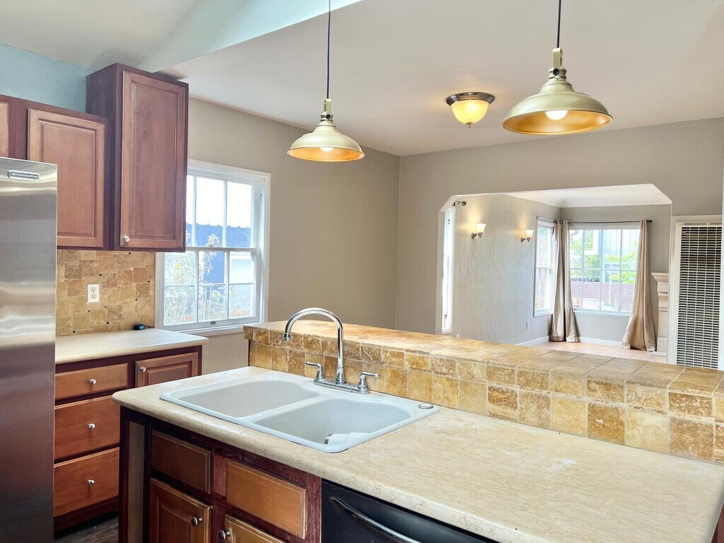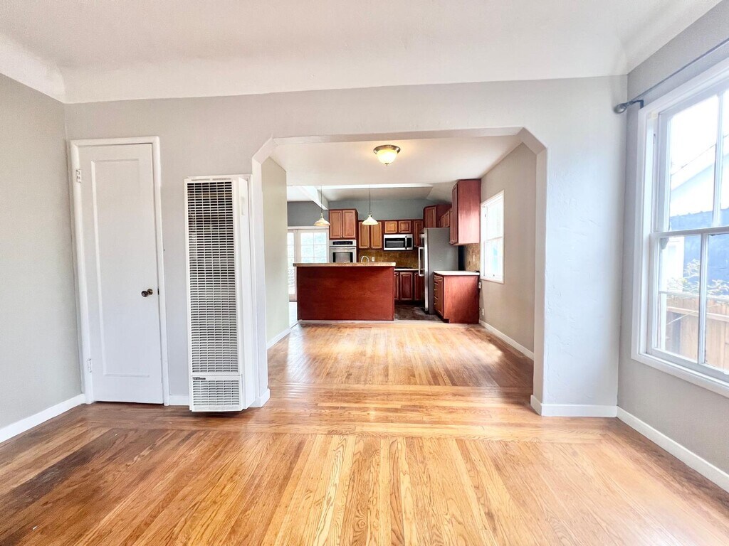 Here are some features of the house: * Quiet residential neighborhood, walking distance to Breads of India and Cafe Trieste * Pleasant 15 minute walk to North Berkeley BART * Interior tastefully painted * Hardwood entry way leading into formal living room with fireplace * Large bright living room with two exposures with formal dining room all on main level * Gas furnace * 2 bedrooms and 1 bath on upper level with 1 spacious closet and 1 smaller closet along with a linen closet and hardwood floors in each room * 1 bedroom and brand new bath on ground level with french doors to backyard providing separate entrance * Newly remodeled office with large storage area * Large remodeled kitchen with plenty of cherry cabinets, granite counter tops, gas cook top, built in oven, microwave, refrigerator, dishwasher, and disposal, flooded with light from skylight. * Large level lot with great deck * Full size energy efficient front load washer and dryer * Parking via driveway, or garage can be used as large storage * Residents handle all utilities. Owner pays garbage service * Built in 1939, home has plenty of original charm * Home square footage is 1450 approx and feels spacious, with good separation between living and entertaining areas. *Lot is 4600 sqft. Updated photos to come Cats ok . Small Dogs (under 25lbs) considered