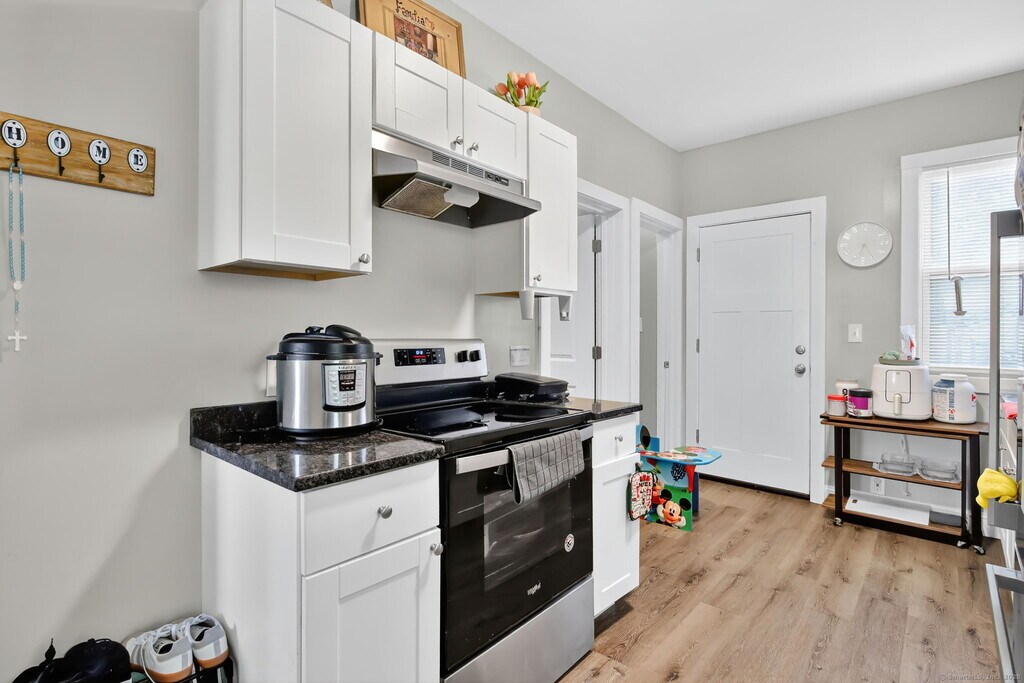 Beautifully Updated 2-Bedroom Apartment Prime New Britain Location Don't miss this fully updated 2-family home conveniently located near downtown New Britain, Central Connecticut State University, major commuter routes, and with a bus stop right outside your door. Just minutes from shopping, dining, public transportation, and Walnut Hill Park, this home offers both comfort and outstanding convenience. This bright and spacious unfirnished 2- bedroom, 1-bath apartment features an updated kitchen with new cabinets, granite countertops, a stylish tile backsplash, and stainless steel appliances. The renovated bathroom includes modern tile and new vanities. Additional features include central air, central heat, hardwood floors, a deck, storage, security cameras/lock and in suite laundry. Outside, enjoy a manageable yard, parking spots infront/communal spot inbetween neighbor and off-street parking.