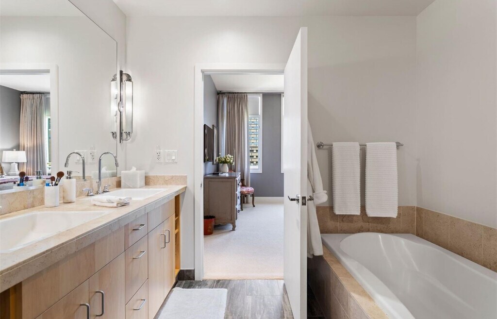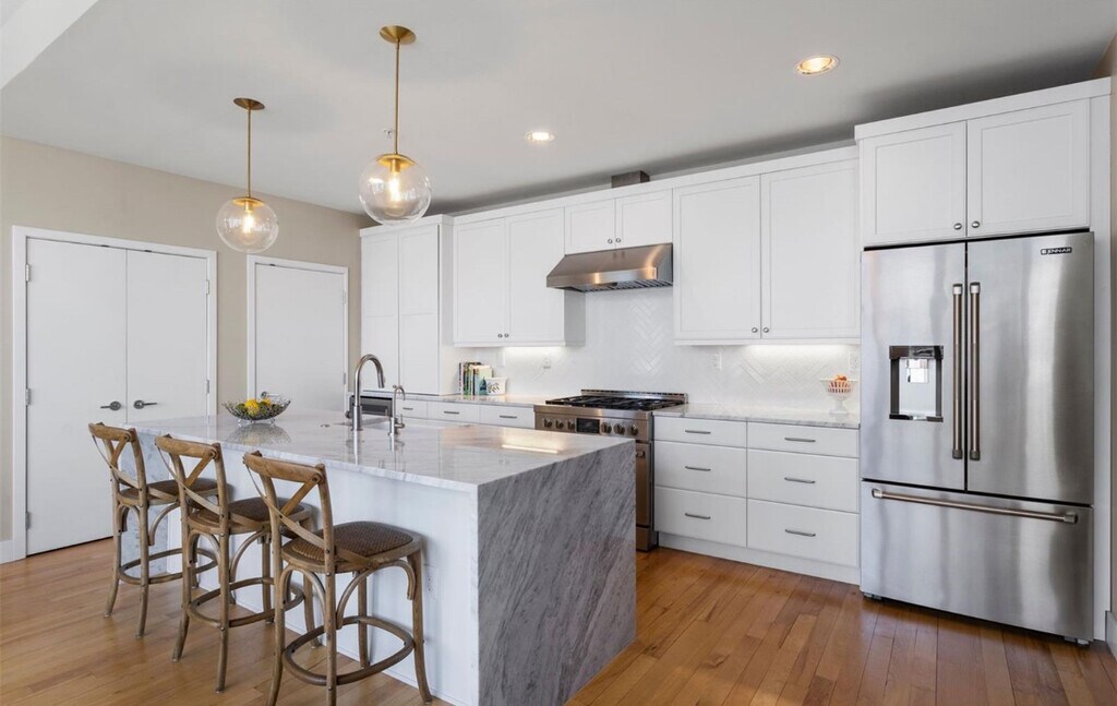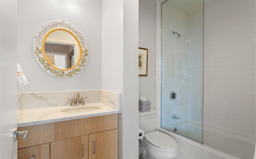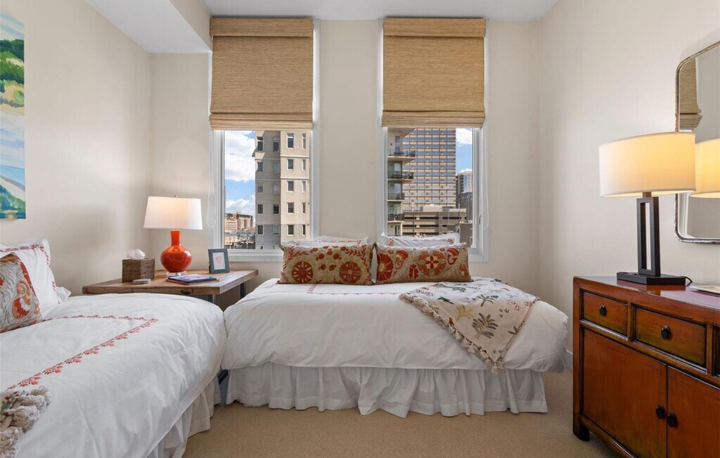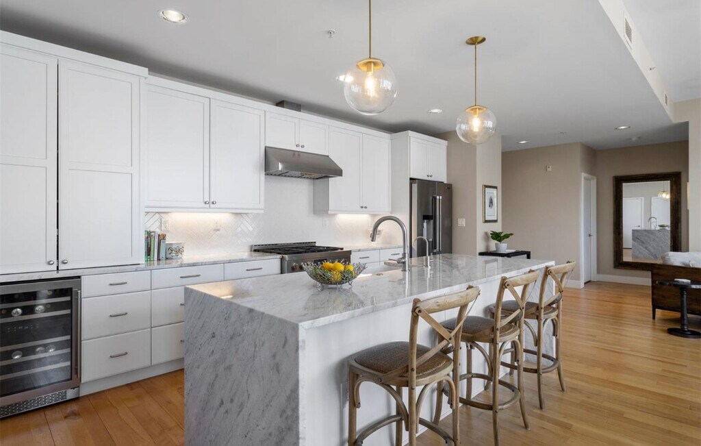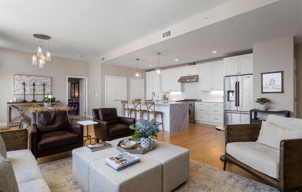 Experience sophisticated city living in this stunning penthouse residence at The Delgany. The open floor plan and sun-filled rooms are perfect for entertaining or enjoying a quiet evening at home. The remodeled kitchen is a chef’s dream, featuring a Carrara marble waterfall island, French door refrigerator with filtered water, and a hot shot faucet on the sink for convenience. Beautiful hardwood floors, high ceilings, and expansive walls ideal for artwork create a refined, airy atmosphere throughout. The living room boasts a full wall of floor-to-ceiling windows that open to a large balcony overlooking the private courtyard. Both bedrooms include walk-in closets for ample storage. The second bathroom is updated with Carrara marble and maple cabinetry, enhancing the light, open feel of the home. Additional features include two garage parking spaces available and abundant guest parking. Enjoy all the benefits of downtown living