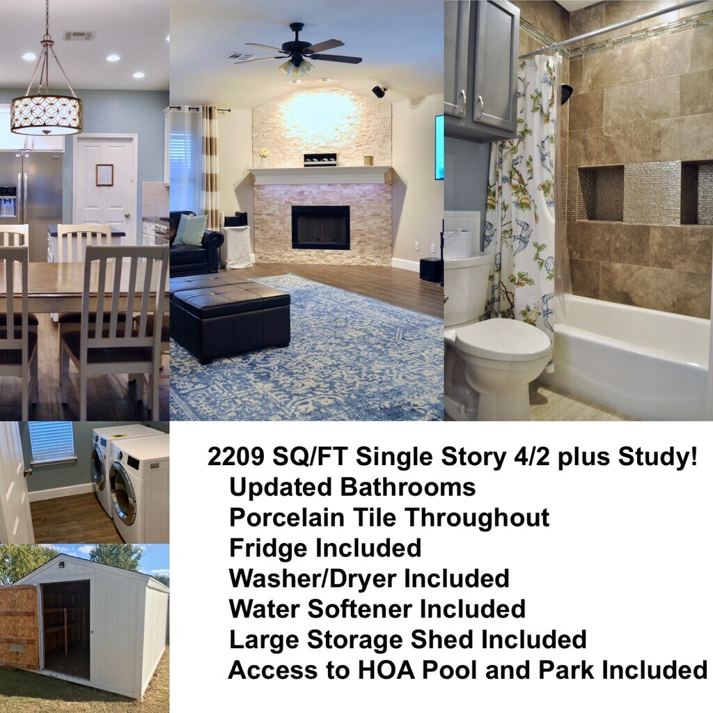 Desc.: Available 6/1/2026. Single Story 2209SQ/FT 4 bedroom, 2 bath plus Study, Laundry in Unit with front load washer and dryer,. fridge, and large storage shed included. On Quiet Street W / access to HOA Amenities (Pool/park). Tall ceilings and Hardwood-look Porcelain Tile throughout (No Carpet). Whole Home Water Softener, Disposal, Stainless Steel Dishwasher, Gas Oven/Stove, and Over-the-Range Microwave also included. Easy access to 35 / 45 / 130. Minutes away from multiple shopping centers. Non-aggressive breed pets negotiable Please work with your realtor to see the property. Thank You