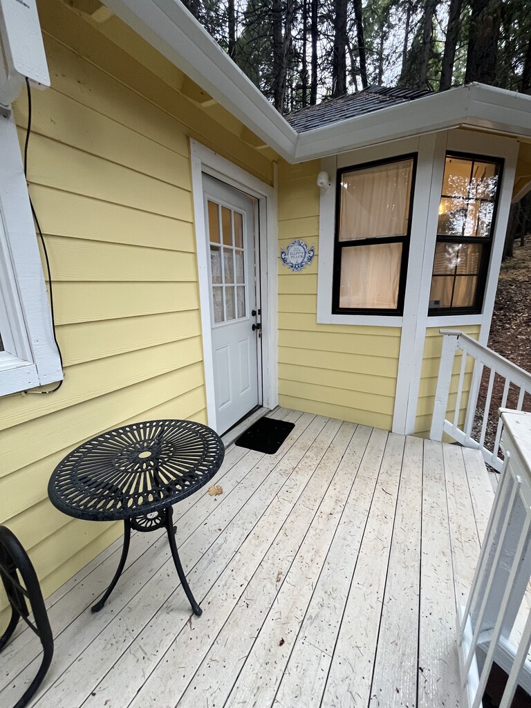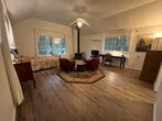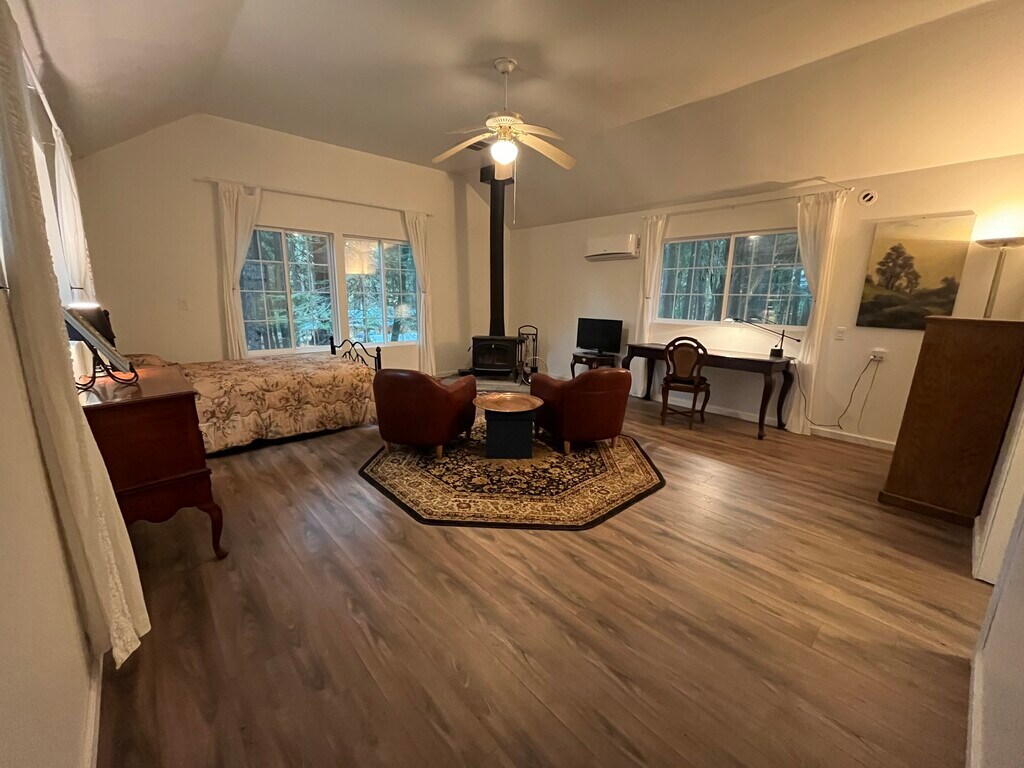 This furnished studio cottage on Banner Mtn offers 450 square feet of living space, featuring one bathroom and separate kitchen. The unit includes essential amenities such as high-speed internet access, heating, and ceiling fans for comfort. The kitchen is equipped for convenience with refrigerator, stove, microwave, toaster oven, and the living area is enhanced by a vaulted ceiling, creating an open feel. The bathroom includes a tub/shower combination for practicality. Additional features include a fireplace, walk-in closet, and washer/dryer hookups. Storage space is also available within the unit. The rental price is competitive for the area. Parking is available in front of the cottage. At 3500 ft elevation there can be occasional snow - all-wheel drive or 4x4 vehicle is recommended. The unit sits on a 5 acre lot, several hundred feet from the main house. No smoking of any kind. No drugs. No pets, Due to limited well water supply, singe occupancy is preferred.