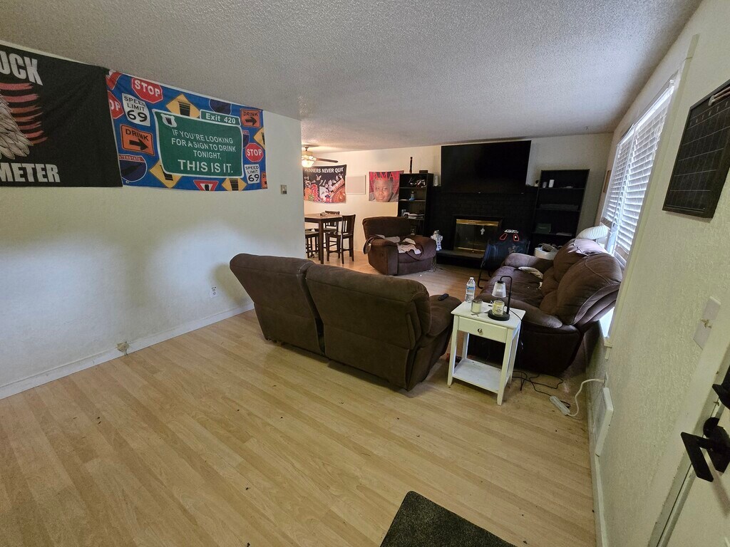 The house has a big living area, full kitchen, washer/dryer, and a decently sized backyard. It's in a quiet neighborhood with easy access to stores and highway.