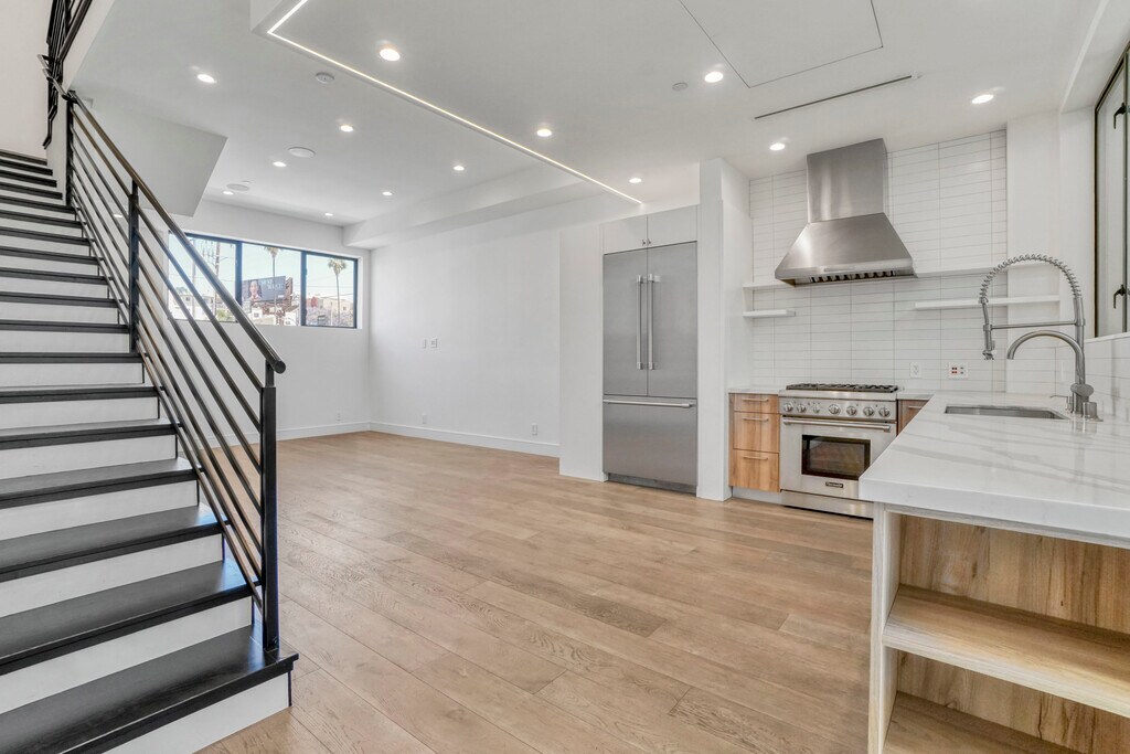 Stunning 3 bedroom, 3 bath contemporary townhome for rent in a highly sought after Hollywood adjacent neighborhood, just ten minutes from The Grove shopping and entertainment complex and steps from Sunset Boulevard. This modern single family townhome offers approximately 1,550 square feet of thoughtfully designed living space with premium finishes, an open concept layout, and a gourmet chef's kitchen featuring Thermador stainless steel appliances. The home includes hardwood flooring throughout, in unit laundry, central air and heat, and access to a private 2 car garage. The third floor primary suite offers a spa style bathroom and exceptional privacy, while the private rooftop deck provides city views ideal for entertaining or relaxing. Located on a quiet residential street near Runyon Canyon hiking trails, Melrose Avenue shopping, West Hollywood dining and nightlife, and with easy freeway access, this pet friendly rental offers walkability to the Hollywood Bowl, Beverly Hills, and top Los Angeles attractions. An ideal lease opportunity for professionals or families seeking modern luxury living in one of LA's most desirable rental locations.