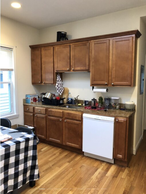 Modern eat-in kitchen, granite countertops, newer appliances, dishwasher, washer/dryer in unit, rear porch, recessed lighting & HW floors throughout, no utilities included in monthly rent.