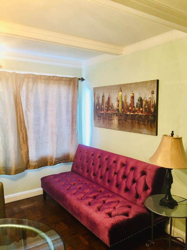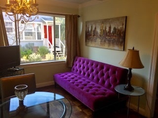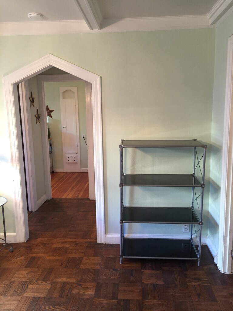 This is a first floor garden style apartment overlooking the courtyard and garden. We have an amazing rosemary bush that is great for cooking. Also, we have a lemon tree and rose bushes. Some tenants can even BBQ in courtyard area. Totally private apartment. GARAGE PARKING AVAILABLE for extra monthly fee. Please email/text me and I will send you a link for the video tour. Full bathroom, kitchen, living room/dining room with designated office space. One bedroom with queen bed, tall dresser, nightstand, and huge walk-in closet that is the length of the bedroom. Fully equipped kitchen with gas stove, microwave, refrigerator, tons of custom-built cabinets, big windows overlooking garden and rosemary bush. Kitchen has everything you need for cooking and eating. All utensils, pots, pans, dishes, glasses, etc. Original built in ironing board. Stainless steel counter and wood block counter. Great for prep and cooking. Art Deco bathroom has vanity, toilet, big bathtub with shower, and built in cabinet for extra storage and window. Living room/dining room has pull out sofa bed, dining table that can seat 4 people, cocktail table and side table and there is a designated office area with a custom-built desk and office chair and Smart TV. We preserved lots of the original details such as a built-in telephone seat, arched doorways, beams in ceiling. The entire apartment has wood floors and is painted with a nice light green color. Apartment is already set up with high speed internet and Smart TV. Full size washer and dryer in garage–Not coin operated. Only four apartments in the building share the laundry. Additional monthly charge for utilities, high speed internet, etc. Some pets allowed depending upon breed, size, etc. Flexible Leases.