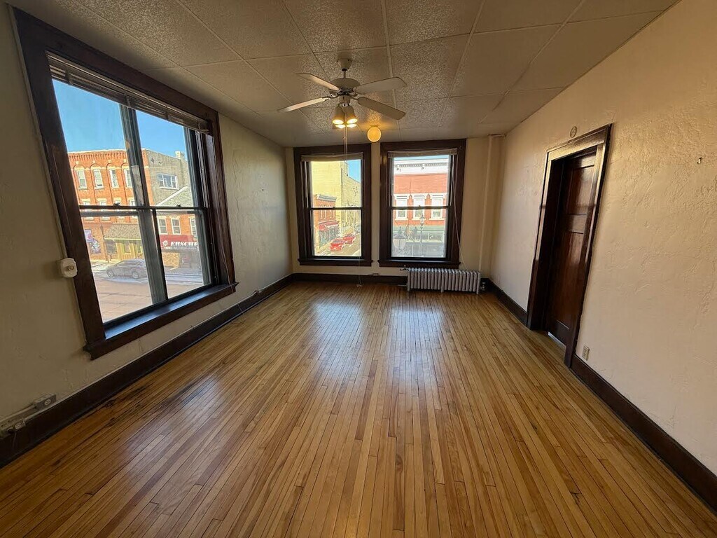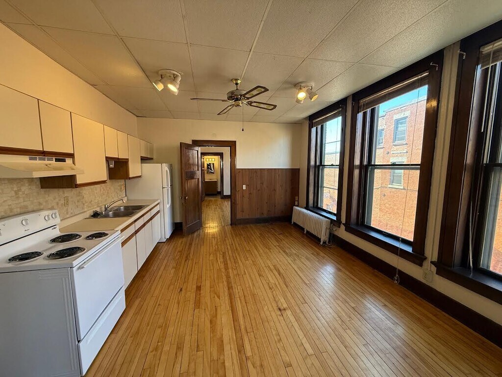 This property at 15 E Main St offers a range of rental units with 1 to 3 bedrooms and 1 bathroom, featuring square footage between 575 and 750. Each unit is equipped with hardwood floors and floor-to-ceiling windows, providing ample natural light. The living room is designed for comfort and functionality, suitable for various furniture arrangements. The bathroom includes standard fixtures, ensuring convenience for residents. Laundry facilities are available on-site for added convenience. The building maintains a smoke-free environment. The exterior features a well-maintained facade, contributing to the overall appeal of the property. Rental prices vary based on unit size and configuration.