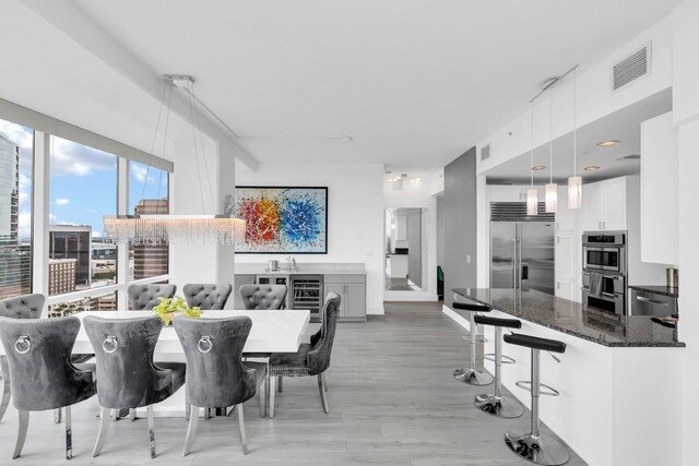 Fully Furnished Luxury Residence with Panoramic Lake Eola & Downtown Views Experience elevated downtown living in this stunning, fully renovated 3-bedroom + den corner residence at The Vue at Lake Eola one of Orlando's most sought-after addresses. Designed for both comfort and sophistication, this fully furnished and turnkey home features dramatic floor-to-ceiling windows showcasing breathtaking, unobstructed views of Lake Eola and the Orlando skyline from nearly every room. The most desired corner unit floorplan in the building! The expansive great room is ideal for both relaxing and entertaining, offering multiple seating areas to take in the views. Unwind on the oversized velvet sectional with a 70" flat-screen TV, host elegant dinners at the 8-person dining table beneath a statement chandelier or enjoy cocktails at the custom-built bar featuring a dual-temperature wine fridge and beverage cooler. Step outside to the wraparound balcony, where you'll enjoy stunning lake and city views equally captivating by day or night. The chef's kitchen is fully equipped with everything needed to prepare gourmet meals (dishes, cookware, etc.) and thoughtfully designed with high-end appliances, including a built-in Sub-Zero refrigerator, Thermador gas stovetop/oven, built-in microwave, and granite counter tops perfect for both everyday living and entertaining. The primary suite is a private retreat, complete with a king bed, custom walk-in closet by Closets by Design, spa-like bathroom with soaking tub, dual vanities, and separate shower. Enjoy direct access to your private balcony with daybed, ideal for morning coffee or evening relaxation. The primary suite has a dedicated brand new HVAC to keep the room extra cool during the summer month. Additional spaces include: - A second bedroom with lake views, outfitted with an executive desk and workspace - A third bedroom with king bed, ensuite bathroom, and sweeping city views - A spacious den/flex room with a double bed, ideal for guests or additional living space - Additional full third bathroom with views of lake Eola from the shower - Dedicated laundry and storage closets with extra built-in shelving This residence is beautifully curated throughout, with designer furnishings, art, and decor offered completely move-in ready. Included in Rent - Fully furnished & fully equipped (everything you see and more) - Gas, water, sewer, and trash - Two reserved parking spaces Building Amenities at The Vue - State-of-the-art fitness center - Heated rooftop pool - Tennis & basketball courts - 24-hour security & biometric access - Concierge services - Outdoor grills & lounge areas - Private theater room - Resident clubroom with lake views - Valet parking for guests ($) Live effortlessly in the heart of downtown Orlando with unmatched views, luxury finishes, and full-service amenities. This is a rare opportunity to lease a truly exceptional, move-in ready residence. One year lease. No smoking allowed. Up to 2 pets total.