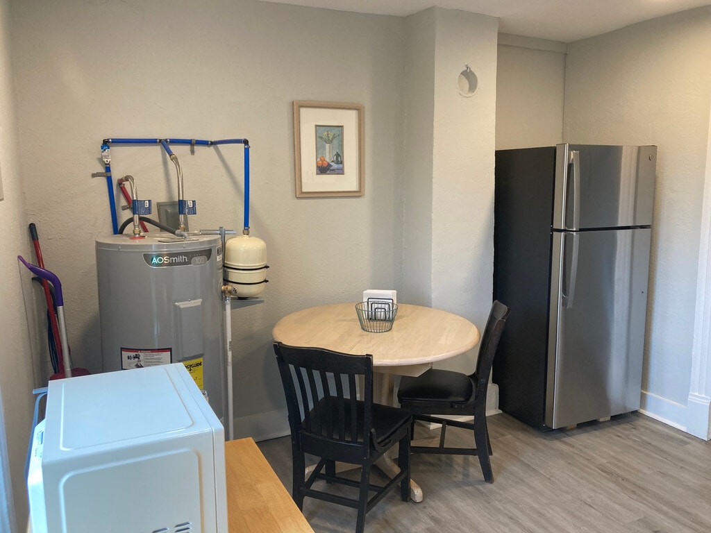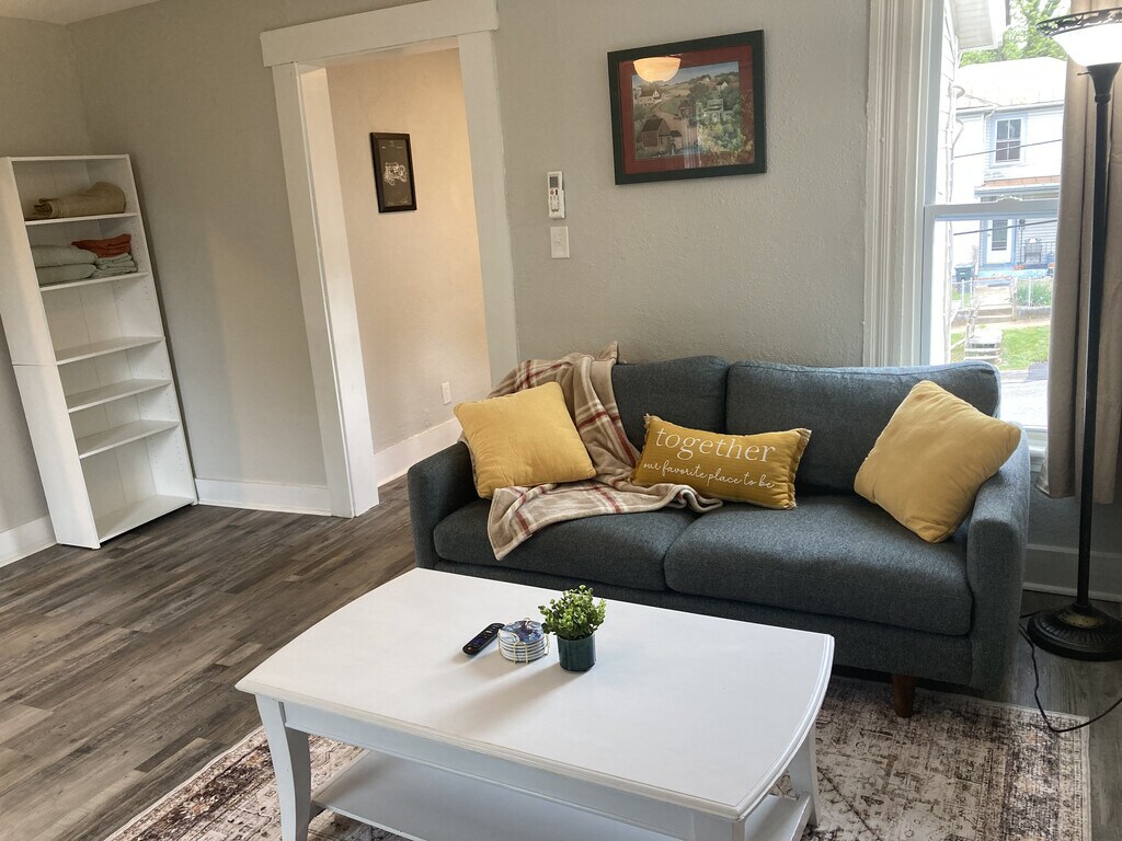 Welcome to Pierce Street, a newly renovated duplex in vibrant Lynchburg, VA. Unit B features 1 bedroom and 1 bathroom with new mini-split systems for efficient heating and cooling. The cozy living room includes comfortable seating, a coffee table, and a 55-inch Roku TV. The primary bedroom has a queen bed, nightstands, a desk, chair, bookshelf, and dresser. The kitchen is stocked with cooking essentials and dining area is in the kitchen but with still ample room to move around and cook.