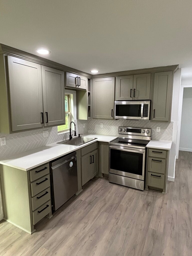 Newly renovated 3 bedroom 2 bath, is cute as a button. Front porch welcomes you to bright family area and open concept dining and kitchen. The kitchen is stunning with beautiful custom cabinets to the ceiling, quartz countertops, farm house sink, herringbone backsplash and stainless appliances. Laminate flooring throughout gives this home a spacious feeling and easy to clean. 3 spacious bedrooms and 2 newly renovated baths with shower and tub combination. The primary bedroom is located at the back of the home for extra privacy. Fantastic utility room with area for sink or extra storage for a mud room and a view of the yard. Large fenced backyard provides spacious area for pets and play! New windows, roof, Sheetrock, paint inside and out, cabinets, hot water heater, insulation in the attic, electrical panel, outlets, gfci connections, flooring, baths, lighting and more. Rental Qualifications: No convictions, 620 min credit score, income 3x the rent.