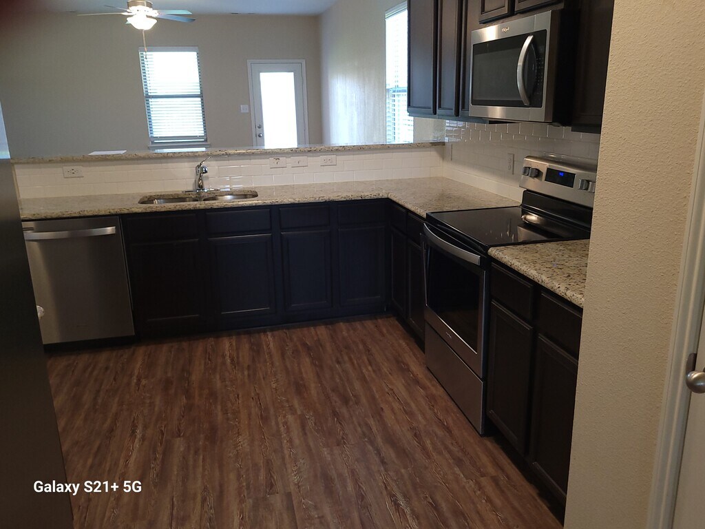 AVAILABLE NOW--ENJOY THE LUXURY OF AN ALMOST BRAND NEW HOME ON LARGER, NO THRU TRAFFIC CUL-DE-SAC LOT! 3BR + 2 bath, 2-car. Kitchen is open to Family Rm. & includes quality granite counters, SS appliances, deep sink, brushed nickel fixtures & custom-look designer cabinets. Luxury quality vinyl flooring throughout for easy allergy-free maintenance. Formal dining room at front of home. SPLIT MASTER has granite bath counter. Appliances incl refrigerator, washer and dryer. Dedicated utility room. Fun features include lg covered rear patio with lots of room to entertain. Latest technology includes radiant roof barrier, fresh-air mixed heating syst. & variable-flush toilets Excellent closet space. Fully fenced and sprinkled yard has rain sensor. Community has several park, basketball and picnic areas.
