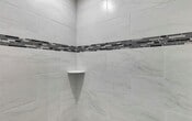 1 level living with 3 bedrooms and 2 bathrooms with master bathroom having double vanity with glass shower door and rain shower head. Both baths have tile floor. The rest of the house is vinyl plank flooring. Washer and dryer in unit with epoxy garage flooring
