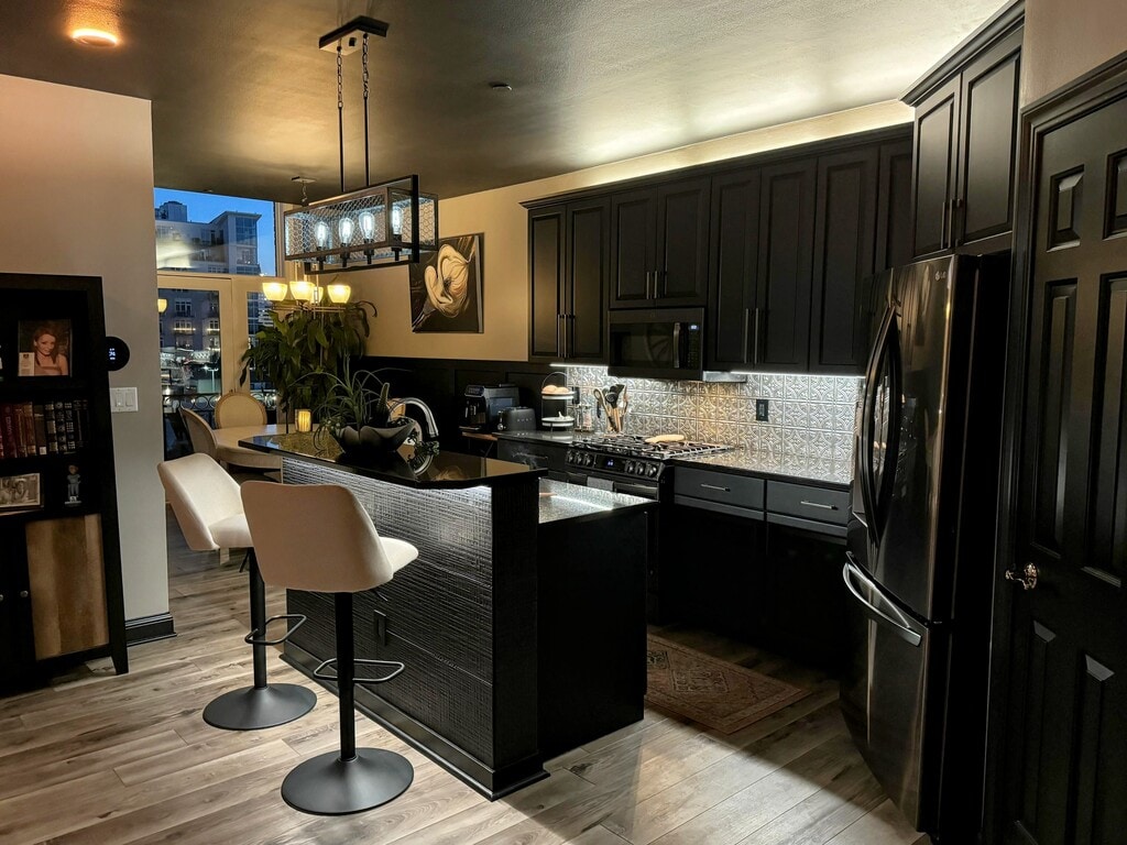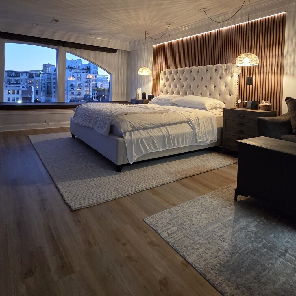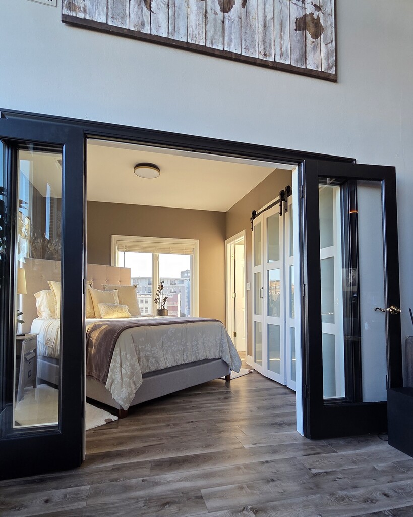 This one-of-kind penthouse southeast corner loft unit has 18-foot floor-to-ceiling windows and two balconies to enjoy breathtaking city views of Milwaukee. Countless luxury upgrades and finishes, including granite countertops accenting the sleek and modern black cabinetry, and a custom tiled kitchen island that comes alive at night with unique LED indirect lighting. All new black stainless appliances, marble gas fireplace, smart thermostat, remote-control blinds, natural gas Weber grill, and gigabit Zentro internet included. Wi-Fi connected light switches and dimmers span the entire home and can be controlled by voice and smart home apps. New luxury plank flooring covers the entire main level and upstairs loft, where you’ll find an expansive primary bedroom with unmatched city views. There’s a custom-built walk-in closet, a 17-foot window bench, in-unit laundry, and a dramatic wood-slat accent wall with integrated LED down-lighting and boho pendant fixtures. The ensuite bathroom features luxurious limestone tiling, dual sink vanity, frameless glass shower, and a jetted tub with Kohler fixtures. The second bedroom on the main level could double as a den or office, with its French door entrance, south and east facing windows, and a barndoor bifold closet. The guest bathroom on the main level features a frameless glass shower and some of the most unique styling you’ll see in the city. Jade tile and wavy wall paneling glow with a lighting surround that you’ll just have to see to believe! Two indoor heated garage parking spots are included, and a generously-sized storage unit in the basement. The building includes two elevators, ButterflyMX touch screen intercom, keyless fob entry doors, and a security camera system that residents can monitor from their phones. Community amenities include a large courtyard, gym, and party room with full kitchen (currently under renovation, available early 2026). Fully or partially furnished options are available at additional cost.