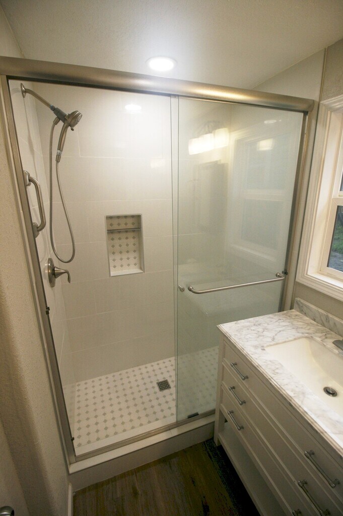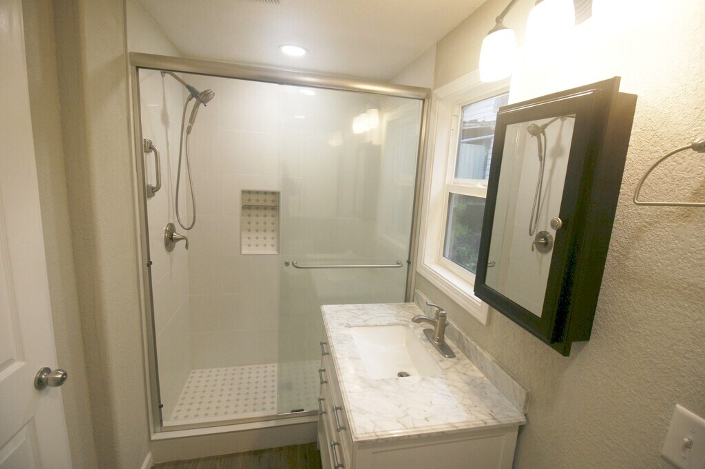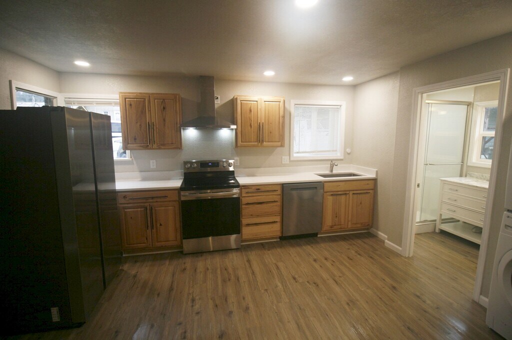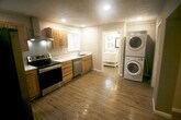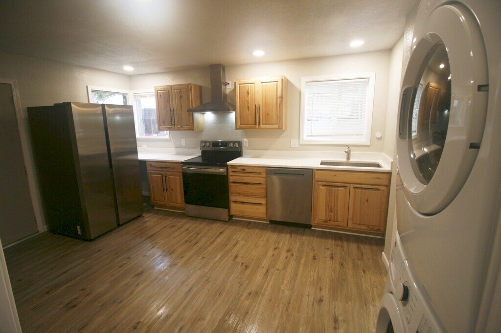 This 2bd/1ba apartment is our most updated and upgraded unit. Kitchen features stone countertops, stainless Samsung fridge with ice maker, stainless LG range with stainless vent hood, stainless LG dishwasher, deep stainless basin sink with stainless single-handle pull-out faucet and garbage disposal, and wood cabinets with oversized black bar pulls. Stacking LG front-loading full size washer and dryer. Vinyl plank flooring throughout. Bedrooms and living room feature crown moldings. Recessed dimmable LED lighting in the kitchen and living room. Dimmable track lighting as well as wall heaters in both bedrooms. One of the bedrooms features a high ceiling with stacked crown moldings as well as full size double curtains. The living room also has full size double curtains. Portable air conditioner. Bathroom features tile shower with stainless and glass doors and aluminum tile edging, stainless grab bar, shower niche with stainless shelf, marble vanity with chrome bar pulls and stainless single-handle faucet, large storage cabinet with oversized chrome bar pulls, one-piece toilet, vanity light, and mirrored medicine cabinet. The apartment's door includes an electronic combo deadbolt and opens into a partially fenced gravel patio area. The building has a gas tankless water heater that provides endless hot water so your shower will never be cut short, and the gas water heat is included in your rent.