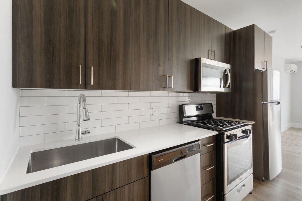 Apartment Features: —Modern Dark Toned Kitchen Cabinets —Stainless Steel Appliances including Dishwasher —Quartz Countertops with Deep Undermount Sink —Open Bright Living Room with Large Windows —Built In Murphy Bed with Storage (Bring Your Mattress) —In Unit Laundry —Designer Plank Flooring —Cooking Gas & Water Included —Pets Welcome (No Pet Rent)