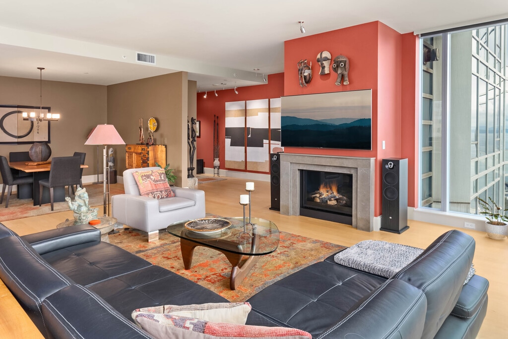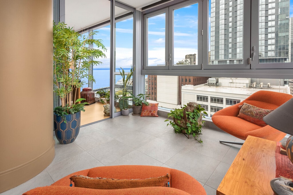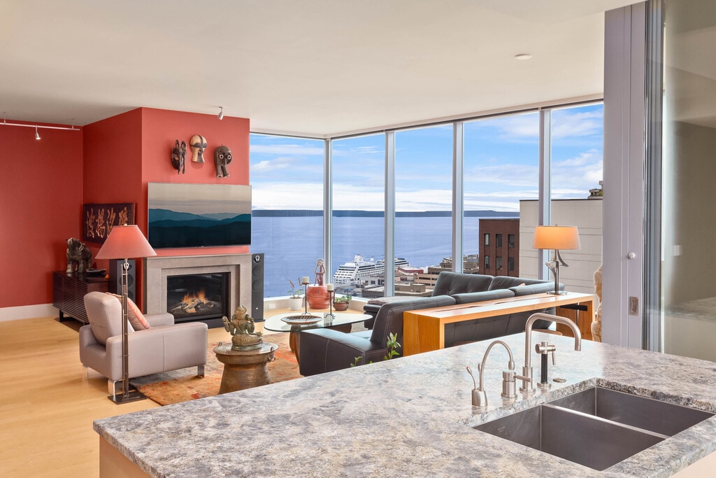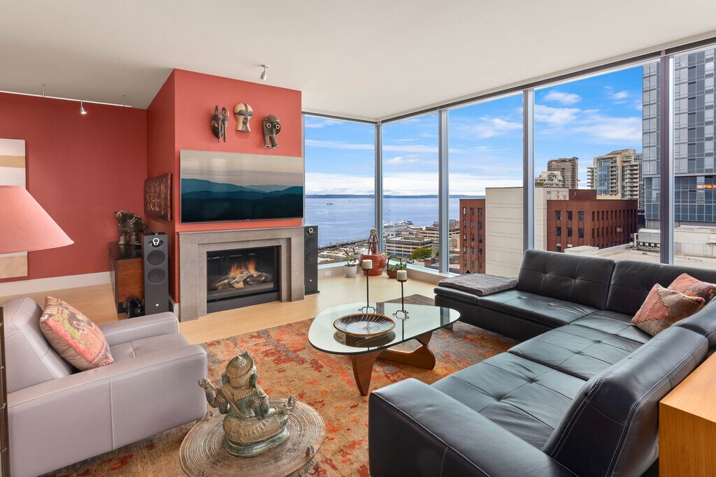 Corner residence with grand entertaining living room with views of Elliott Bay, Olympic Mountains, Seattle waterfront and city skyline - it's a treasure. Endless entertainment with sailboat regattas and Pike Place Market. This home has art gallery entry, epicurean kitchen with Wolf, Subzero and Miele appliances. Not to be missed - large pantry, luxurious primary suite, spa bathroom, Toto tub, motorized blinds. Just steps from Pike Place Market, Benaroya, stadiums, the arts, retail and Sculpture Park. Concierge 24/7, Walkscore 99 and two blocks to light rail. Rooftop terraces, gardens, BBQ, gym, yoga studio boardroom, sky lounge. Included: gas, water, sewer, garbage, EV parking available!