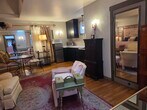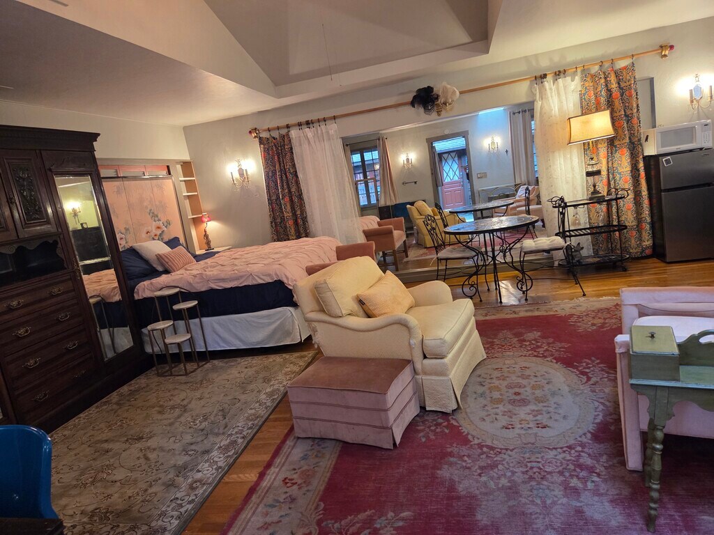 This apartment is separate from the main house so is very private and cozy. Formerly a dance studio, it has hardwood floors, vaulted ceiling and lots of mirrors. It comes furnished with a very comfortable king sized bed, two wardrobe cupboards, table, chairs and other small cabinets. The kitchen has a refrigerator, microwave, extra large toaster oven, coffee maker, but no stove. (some tenants add a cooktop which fits easily on the counter.) On demand hot water heater makes for a great shower; and the new mini split will keep you toasty in winter and cool in summer. There is a porch outside the entry door for this tenant's use, and a lovely communal yard which the property manager maintains. Off street parking. Laundry mat six clocks away; one block from Food Co-op. ALL Utilities AND WIFI Included. Sorry - no pets. (Feel free to drive by but please do not disturb tenant in front house. Email with questions or to make an appointment to view. Thank you)