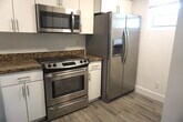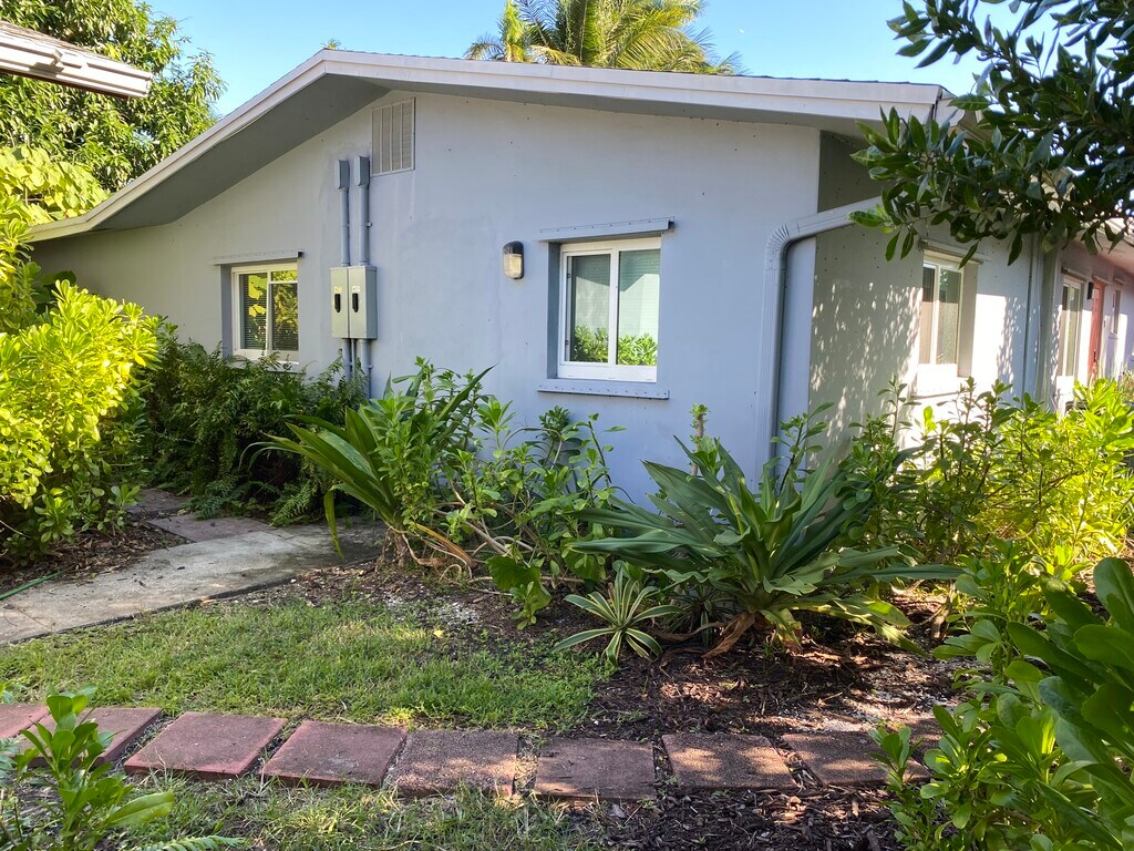 BEST PRICED 3/2 EAST OF U.S. 1 ** Showings start Nov. 15 ** ** Call for showing appointment ** Completely renovated. Huge 3 bedroom, 2 bath, 1,350 sq. ft. apartment set in a large park-like, tropical yard; with private backyard with 2 gated parking spaces for just $3,100/mo (water included - $80 value). Spacious and airy interior features wood grain tile throughout, granite countertops and stainless steel appliances in the kitchen. The living and dining room areas are both very roomy and open. The large master bedroom is buffered from the two other bedrooms for privacy and features a walk-in closet and a linen closet, a large bathroom with his & hers vanities, and an oversized shower. The two additional bedrooms share a bathroom with a tub/shower. Corner bedroom could also be a spacious home office. Washer/dryer in unit. Tankless water heater. Full impact windows. This LED home helps reduce electric bills. Surrounded by lush landscaping with a 12' x 20' deck. Small dogs and cats okay, with a pet deposit. Owner pays for water & lawn service. Renter pays for electric. Located in the casual, friendly Royal Poinciana neighborhood east of US1, the home is a short bike ride from the beach, with two golf courses 2 blocks away. Located minutes from Downtown Hollywood, residents have a wide selection of shopping centers, grocery stores, restaurants, nightlife spots, and entertainment options close to home. Locals gather at downtown's Young Circle Park, a popular green space for art festivals, food trucks, and movie screenings, or spend the day at one of the many parks and evenings at the many entertainment venues on A1A and Hollywood Beach's Broadwalk. No EVs or LEVs (ebikes, etc.) No Smoking or Vaping in the home 1st month rent and 2 months security deposit required. Additional Amenities: Private Backyard, 2 Private Gated Parking Spaces, Outdoor Storage, Energy Efficient Hurricane Windows, Tile Floors Throughout. Water included Lawn service included
