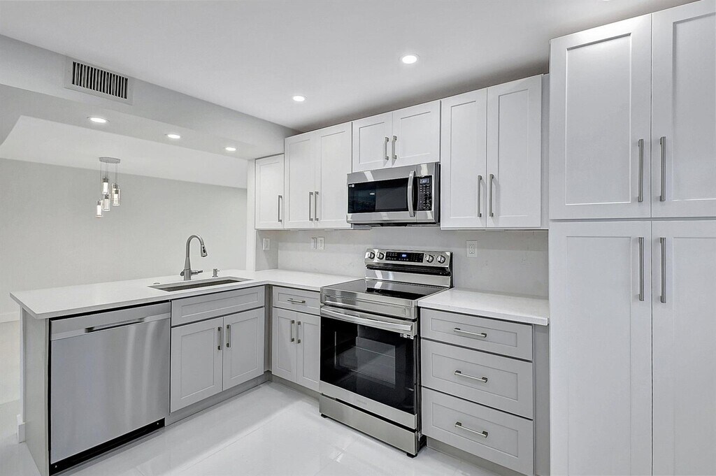 Under construction and fully remodeled, this ground-floor corner unit in the sought-after Lakes of Delray offers stunning lake views and easy access--just park and walk right in! The open-concept layout features a spacious eat-in kitchen with white cabinetry and a convenient pass-through. The owner's suite includes ample closet space and an en suite bath with a step-in shower. Enjoy breathtaking views from the screened patio. Lakes of Delray is an active 55+ community offering resort-style amenities--clubhouse, multiple pools, spas, tennis, pickleball, and endless social activities.