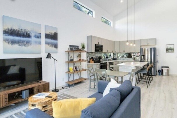 This modern country home is fully furnished for a 6-24 month rental in Canyon Lake. Low-maintenance river stone front yard, covered back deck and close to the water (Comal Park). Inside you will find a a spacious living area with custom windows and soaring ceilings that flow into the kitchen with a prep island, quartz counters, stainless steel appliances, and modern Edison lighting. A beautiful farm-style door leads to a bathroom with a backlit LED mirror, black plumbing fixtures, and shower. Two generously sized secondary bedrooms complete the main floor. Upstairs features the primary bedroom with a private bath and has access to an outdoor balcony. Lease terms are negotiable.