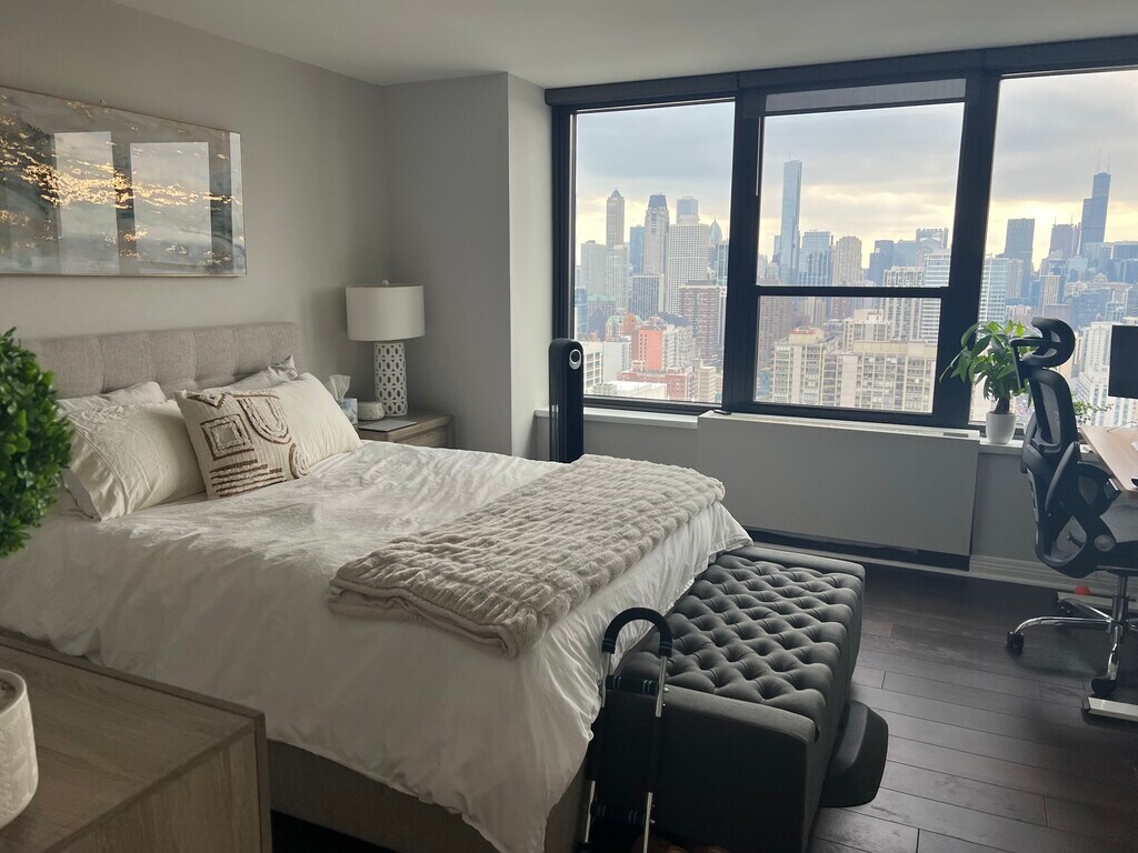 If you crave Lake Michigan and skyline views, this is your dream home in the sky! Perched high on the 40th floor of the coveted James House, this rarely available southeast-corner residence glows with natural light and sweeping, unobstructed views that stretch from the lake to the city. The split 2-bed, 2-bath layout with W/D in unit (1,250 sq ft) offers both comfort and privacy. The primary suite features custom closets and a beautifully updated en-suite bath. The second bedroom is perfect for guests or a stylish home office. An ultra-modern kitchen showcases sleek granite counters, stainless-steel appliances, and a designer backsplash-ideal for entertaining with a view. Enjoy the convenience of in-unit washer/dryer, and a rent that already covers Wi-Fi, cable TV, heat, water, scavenger, exterior maintenance, and internet access. Building amenities include 24-hour door staff, a rooftop deck with jaw-dropping skyline vistas. Seasonal pools and tennis courts are available by membership, and heated garage parking is ready for $190/month. Bike storage & fitness room available at buildings monthly fee. All this in an unbeatable location-steps to the lakefront, Lincoln Park, North Avenue Beach, the Red/Brown Line EL, Wells Street dining, boutique shopping, and nightlife. Experience the best of Chicago living-sun-drenched mornings, endless views, and the energy of Old Town and the Gold Coast right outside your door. Available now. Minimum 12 mo lease preference would ben 14 - 18 month lease