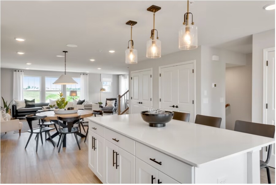 New home - Conveniently located within walking distance to grocery stores, restaurants, shopping & trails. Gorgeous kitchen with the most popular interior finishes; quartz countertops, white cabinets with quartz countertops and gas stove...an entertainer's dream! Upstairs you will find a stunning owner's suite with a private bath featuring an oversized, tiled shower. Two additional bedrooms and an upstairs laundry. School District - 196
