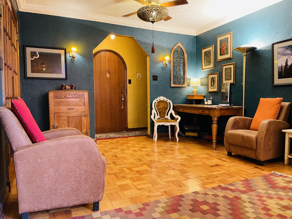 FULLY FURNISHED - Gorgeous, peaceful and historic city park condo - fully furnished! A perfect retreat in a bustling city location! This large (855 sf) one bedroom was built in the 1920's, an era where apartments still offered lovely architectural detail and comfort. The building originally housed the nuns of the Sisters of Mercy who worked at the nearby Mercy Hospital (now gone). You'll find gorgeous details like: original parquet floors throughout, arched doorways, generous built in cabinets, fine wood and iron work throughout. The apartment is on the first floor and overlooks the building's courtyard and garden. The space itself provides a large living room with space for a desk / work area, a unique octagonal dining room, fully stocked kitchen, large bedroom with unique Indonesian Box Bed, charming bathroom with original tiles and fixtures, and a lovely hallway that connects it all together. Stepping through the doorway, you step back into a time when little details and excellent craftsmanship were essential values for living. The apartment is one block from City Park - one of Denver's largest and most beautiful parks. It is also one block from a stretch of the famous Colfax avenue that is quite lively - full of restaurants, cafe's, shops, and entertainment. Denver's newest recreation center, the Carla Madison Recreation Center, is just a few blocks away. For traveling nurses, the location is also convenient to several Denver hospitals. Perfect for traveling professionals who want a unique a luxurious city apartment - fully furnished - for a minimum of 3 months. Please note that we do use the apartment from time to time between leases and that we have a cat. We always do a deep cleaning when we leave but for those with cat allergies, this may present a challenge.