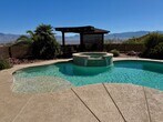 A private oasis in Mesquite. Private backyard with sweeping views of mountains and mesas, with in-ground pool & jacuzzi. Large covered patio with living room, dining table and outdoor kitchen. Patio can be enclosed via automatic slides, allowing 4 season use with independent AC and gas fireplace. Primary bedroom has large ensuite bathroom with electronic toilet & bidet, large jacuzzi tub, and large walk in closet (with built-in organizers). Guest room and full guest bathroom are co-located. Two car garage, with lots of storage. Office with built-in cupboards. House is 1 story, on cul de sac, located in coveted Sun City community. Renters must be at least 55 years old. Rental is being offered furnished, but can be emptied if requested.