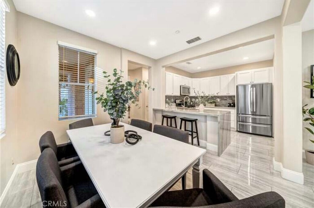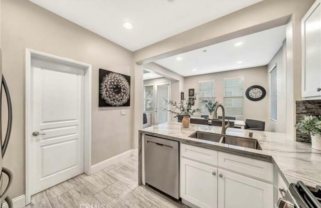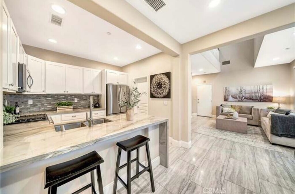 Experience ideal Ladera Ranch living in this meticulously remodeled Greenbriar end unit. This 3-bed, 2.5-bath home spans 1,736 sq ft, boasting porcelain floors and granite walls. The open floor plan seamlessly connects living spaces, revealing stone walls, vaulted ceilings, and ample natural light. A gourmet kitchen with waterfall marble countertop, granite backsplash, and stainless steel appliances awaits culinary enthusiasts. Outdoor living is elevated with multiple patios for entertainment or relaxation. The upstairs sanctuary includes a spacious primary suite with a large walk-in closet, dual vanities, and a remodeled shower. Two well-designed guest rooms feature open space and large baseboards. The upper level showcases a homework niche and a completely re-designed guest bathroom with granite and floor-to-ceiling customization. Modern comforts abound, from tile floors to LED lighting. The two-car garage comes equipped with a 220V EV charger and ample storage solutions. Located across from Founders Park, pools, and award-winning schools, this residence embodies comfort, style, and convenience. Welcome to the heart of Ladera Ranch, where true luxury meets architectural excellence. Furniture not included.