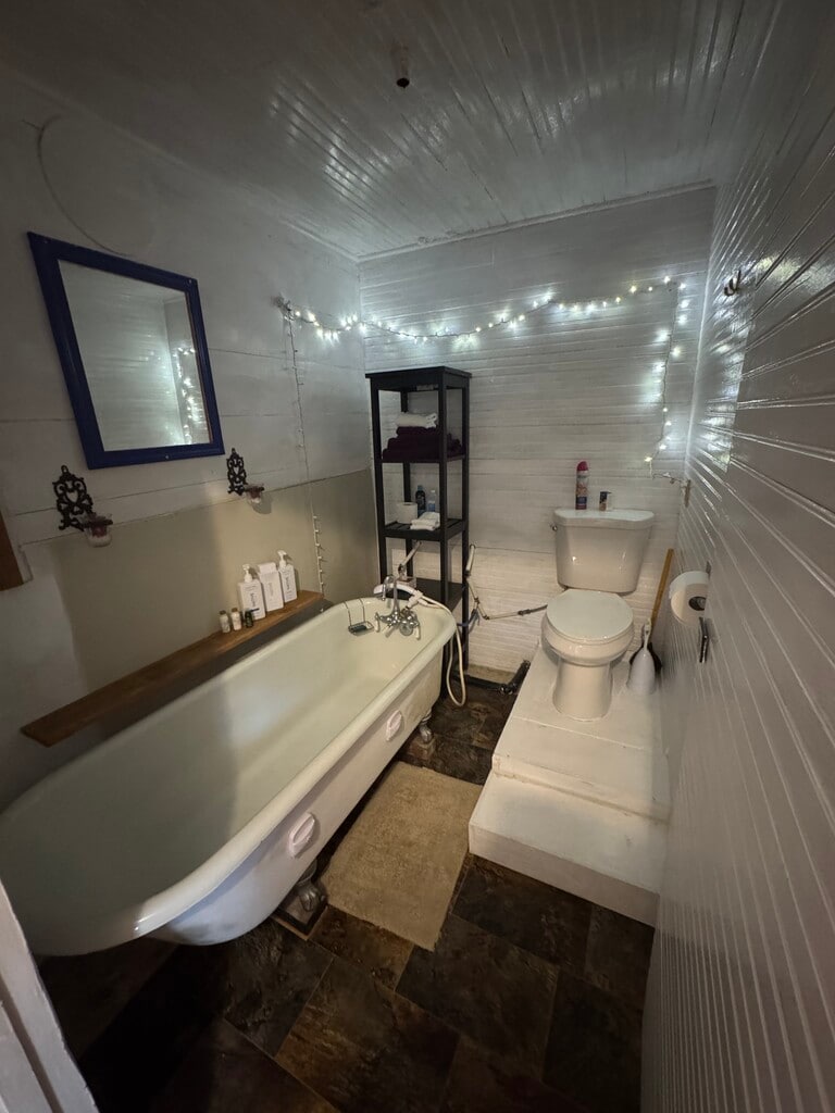 Rustic style studio unfurnished with large living room/bedroom, modern kitchen with full LG oven-stove & mini-Bosch didhwasher, new flooring, laundry area/closet (dryer is outside on porch & there is a clothes line) & your own private in unit bathroom with antique clawfoot bathtub with hand shower wand. You also have access to a shared bathroom with full stand up shower separate from unit but just steps away from your unit's back door in case you want a standup shower. Unit has a sitting area on each side and access to shared area behind unit. Utilities not included and some are shared billing. Heating is electric and natural gas. Tenant has walking access of area past unit on the remaining 4 acres on mowed paths (but not to bother tent renters) giving spectacular views of Puget Sound & Mt Rainier excepting areas around tents. Possibility of adding on a full bedroom quickly (currently it is a garage attached to this unit) but will be at extra cost per month (about 250sf more space which is 60% more space making total greater than 650sf). Planning to add external storage units on property but would be extra per month (but at a fair price).