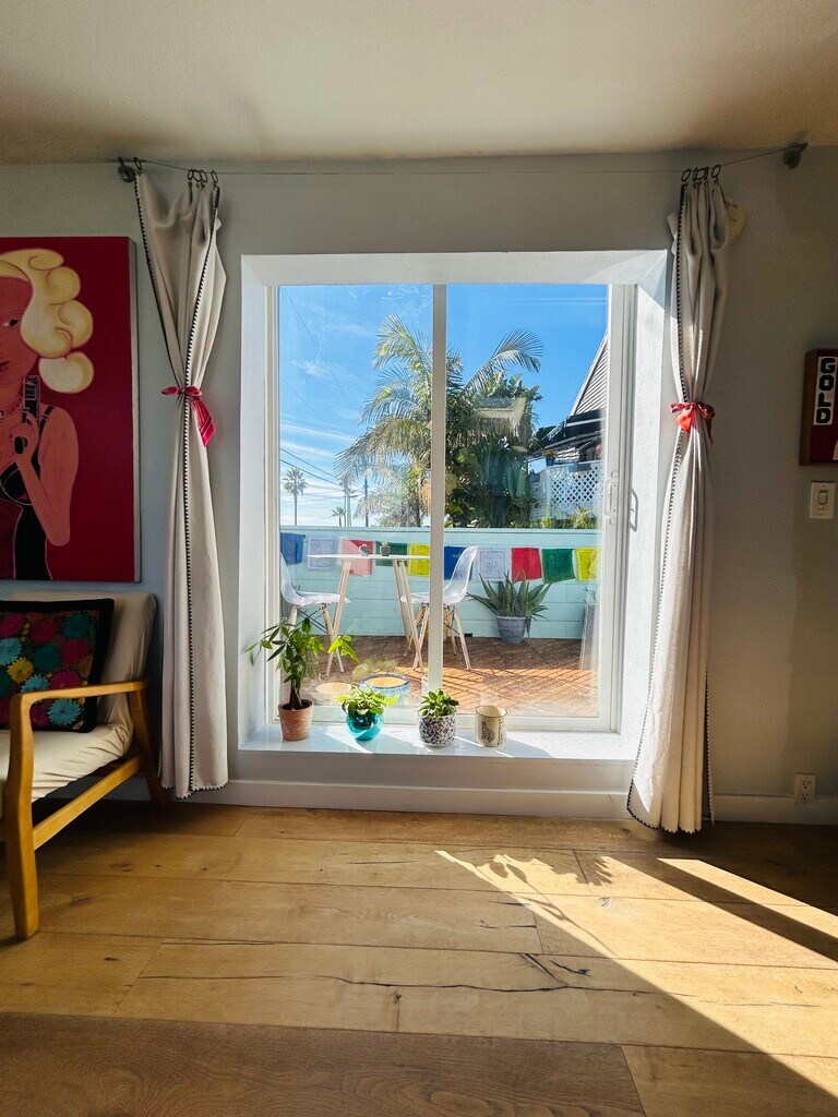 Fully furnished and turn key house a block from the beach with skylights and ocean view sunsets from the loft bedroom. Walking distance to everything in Leucadaia neighborhood including farmers market, coffee shops, restaurants, yoga, etc! Outstanding location. This is an artist's sanctuary home. Unique and chill vibes. Downstairs is open floor plan with living and kitchen with a second bedroom converted into a tv room. A fully balcony above has plants and lounge areas and table for eating and watching the sunset. Downstairs deck has lounge areas and an art studio space you can do as you wish. Also has outdoor shower and storage for bikes and surf boards. A wonderful place to call home.