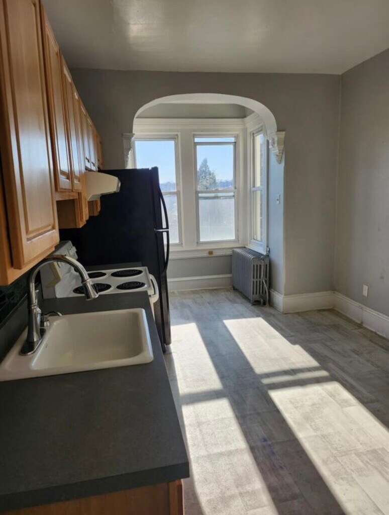 Large bright apartment with oversized kitchen. Original hardwoods floors, spacious bedroom, walk in closet. Ceilings fans in bedroom and living room. New floor in bathroom and kitchen. refrigerator and electric oven. New energy efficient radiator heat and thermostat control. Large closet in foyer . Numerous kitchen cabinets and a breakfast nook with great views. Walking distance to Kelly drive and main Street MANAYUNK, shopping and dining. Apartment is close to several major universities and 2 blocks from the Wissahickon train station. Access to great hiking and biking, only 2 blocks to the main entrance to park and the famous 100 steps which lead to the river. You can bike ,walk , or hike, enjoy nature, while living in the city. Fantastic block with mature trees and green lawns. Plenty of on street parking. Owner pays for Lawn care, common electric, water , and trash removal. Lease is for 1 year term.