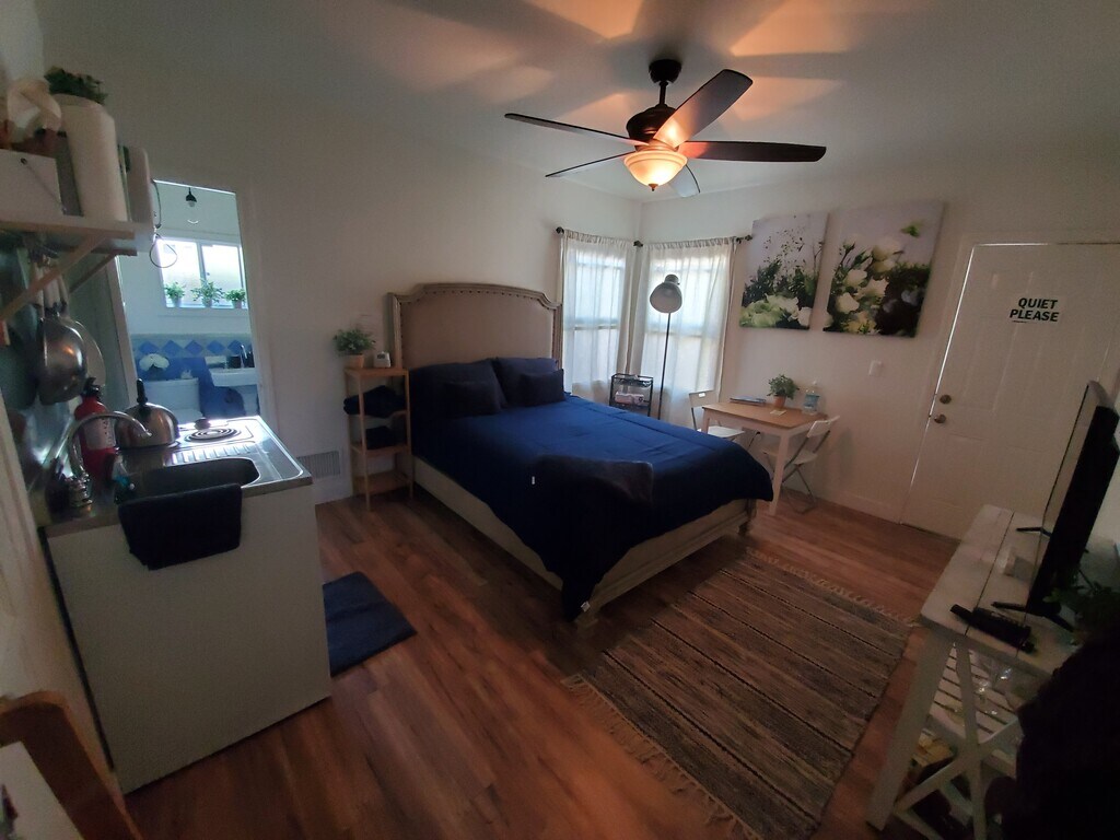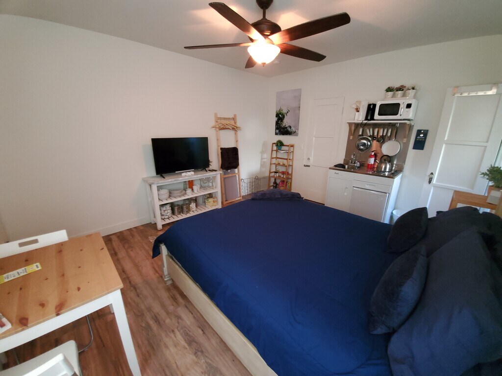 Private Studio right in the heart of LA! Walking distance to The Grove, Melrose, 3rd Street, Beverly Center, and more! Super clean and comfy studio to call home. Total privacy that includes separate entrance. The unit is secured with a state of art surveillance 4k UHD cameras and other security devices. NO TENANTS/NEIGHBORS LIVING ABOVE OR UNDER, THIS MEANS QUITE LIVING CONDITIONS AS OPPOSED TO AN APARTMENT BUILDING. The unit was recently remodeled with a new beautiful floor and paint. It can come furnished for an additional cost; however, it will include a kitchenette and a personal AC heater combo unit with no additional cost. Additionally, the unit has a small closet room. Rent includes electricity, water, gas (water heater), trash removal and sewage "services", and WIFI 6E ( AT&T fiber internet connection). Essentially all of the amentias are included. SF listed doesn't include the back yard which can be used by the tenant! This studio is ideal for a single occupant.