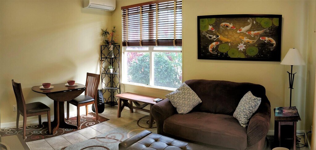 ¤ Now Available ¤ highly desirable Ke Alii Kai neighborhood. ¤ No monthly or short term rentals are considered. ¤ 6 months minimum or 1 Year Lease preferred, Applicants must have good+ credit. ¤ Listing price does NOT include utilities. Basic electricity and water will be an additional discounted flat rate. TV/cable/internet are not included; you'll arrange those services as desired. ¤ Listing price as shown is for 1 year lease Our Cottage /detached Ohana - is a lovely, quiet, separate small building with 1 bedroom, 1 living-room, kitchen, bath, 500sq ft. unit; lightly furnished, located in the very nice Ke Ali'i Kai neighborhood, close to both Wailea/Makena resorts and south Maui Tech Park (5 to 10min either,) or 20 to 25min to Maui Memorial Hospital.. It's just a couple of minutes' walk down the hill to Kam 1 (Kama'ole 1) beach, ABC store + Bus, Hawaiian Moons health store, etc; a great morning stroll, and all around great jogging or bicycling location. • Includes: washer/dryer, recently added mini-split air conditioning in both rooms, ceiling fans, refrigerator, stove, garbage disposal • Separate locking mailbox • about 700 yards or so just up the hill from Kam1 -Kama'ole Beach Park1, ABC store / bus stop • No smoking, flame nor e-cig/vape of any kind (in or out) • Sorry No Pets • Tenant provides for their own TV service and/or internet service as desired. Seek pleasant quiet renters who will keep the unit very clean with very good credit and references. Sorry no pets, drugs, or drama. Applications and screening checks are done via this website. Although Application Forms are required, it might be best to reach our first to inquire as to relative region, costs, suitability & availability, as we're not involved in the automated application and background checks via this site which are non-refundable. • 1 Year Lease preferred, 6 months minimum, NO month to month nor any short term rental • Excellent and clean condition; • weekly trash service curbside pickup • Nice wood blinds in Bedroom, Living Room, screened slider with Bali cellular shades, • Off-street parking for 1 small quiet car *