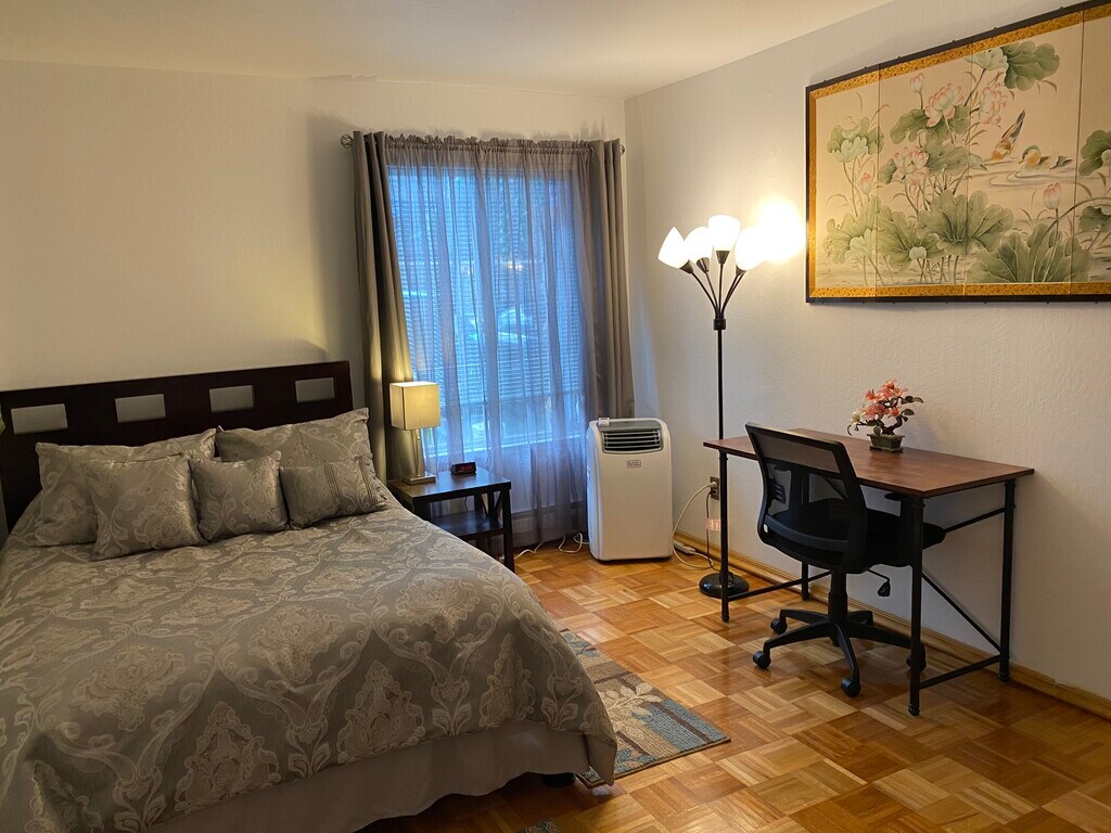 Sophisticated, elegant, spacious, completely remodeled and fully furnished (with all electronic appliances and WiFi) 1Br / 1Bth in absolutely pristine condition offered for rent/ lease by owner. Price include all maintenance, water, garbage, cable & WiFi expenses. Electricity not covered. Central location for Silicon Valley, 1.5 ml from Apple headquters intersection of El Camino Real and Lawrence Expwy with close access to HWY 101, 280 and Central Expressway. Public transportation with Bus stop 3 min walking distance to El Camino Real. Central location for dining and shopping. Condominium complex has 2 adults and 1 children's pools with tennis court, gym, cabana for public events, BQ aria, very large garden with court yard and nigh private security service. 1Br / 1Br unit description. Newly completely remodeled 1Bth / 1Bth newly painted with parquet and marble floor unit on the 1st floor. Living Room. Very spacious living room with sliding door leading to the patio. Furniture: L-shape sopha with coffee table, dining set for 4 people, dish cabinets, 2 standing lamps, speaker system and 48” TV with cable, A/C in living room & A/C & Humidifier in the bedroom. Bedroom. Very spatios bedroom with closet. Furniture 1 Queen size bed, night stands, table with chair, standing and desk lamps. Kitchen. Brand new fully equipped kitchen with marble floor and countertops with all new alliances in brashed stainless steal. Bathroom. Brand new fully remodeled bathroom all marbled with frameless shower in brushed nickel. Additional closet in the hallway and outside patio storage. Patio with plants (which needs to be watered) and furniture for enjoyment. Patio has direct access to the parking. Carport Parking space # 214 included at no cost to the tenant and additional free parking for the second car. Laundry facility in the building 1st floor near to the unit. Please let me know if you are interested.