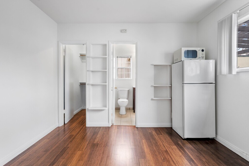 TRUE BACHELOR WITH NO KITCHEN BUT INCLUDES FRIDGE AND MICROWAVE. STREET PARKING. GREAT CREDIT REQUIRED. CALLS ONLY, PLEASE DO NOT APPLY ONLINE. Call for private showings and virtual tours. Cozy bachelor unit on the best street in Venice, Abbot Kinney Blvd. Walk a few blocks to Erewhon, Alfred's Coffee, Gjelina, all the best shopping and restaurants on the best part of Abbot Kinney Blvd, and near the Venice Canals and the Venice Boardwalk. Unit has brand new flooring and comes with a fridge and microwave. Wall mounted HVAC that provides both heat and air conditioning. The bathroom features a modern vanity, medicine cabinet, and a pink tiled shower with a large soaking tub. Nice sized closet. There is an on-site shared laundry room. 4 off street spaces first come first serve in rear of building. Lots of street parking available. Cute cottage style apartment community with decorated walkways with Spanish tiles. Fantastic price for a clean unit in an unbeatable location.