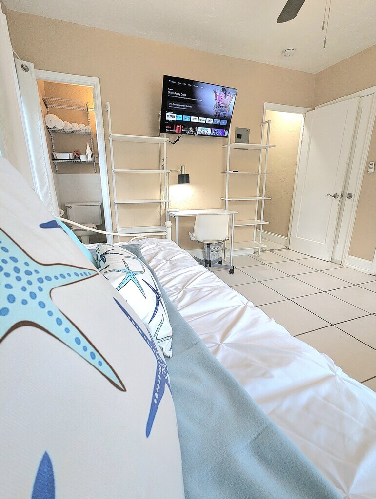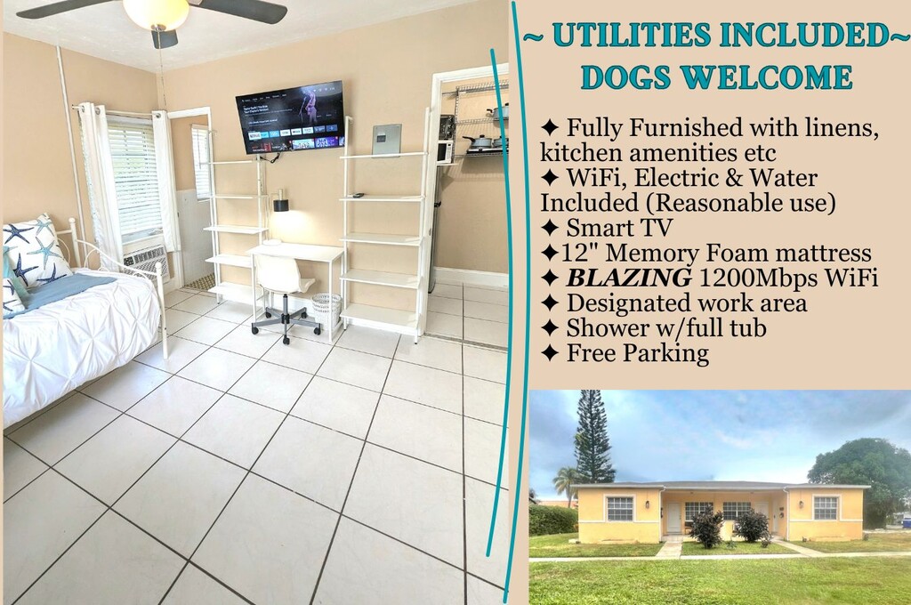 * Furnished with *Reasonable use* of electricity, water, Wi-Fi included. __________________ BIG DOGS WELCOME! FURNISHED, WI-FI, ELECTRIC, PARKING, KITCHEN SUPPLIES & LINENS INCLUDED***Welcome to our cozy studio apartment, set in a charming garden complex, in Hollywood Beach, Florida! Perfectly located just minutes away from the beach, or from downtown Hollywood with easy access to Miami or Ft. Lauderdale. Our studio, although compact, is thoughtfully furnished with everything you (and furry family member) need to feel comfortable. __________________ SLEEP: You'll enjoy a comfortable night's sleep on a 12-INCH MEMORY FOAM MATTRESS with fluffy pillows & a blanket. You can lounge comfortably watching the wall-mounted SMART TV. Wake up refreshed and ready to start your day. The convenient BED-SIDE EXTENSION CORD ensures that you have easy access to charge all of your devices. The nearby TABLE LAMP provides cozy lighting for reading or enjoying TV. __________________ RELAX: Whether you're looking to relax after a long day or simply unwind with your favorite show, our wall-mounted SMART TVs will provide you with a high-quality viewing experience for streaming your favorite subscription services (Netflix, etc.). __________________ WORK/Wi-Fi: Be productive with our blazing 1200Mbps Wi-Fi at the designated DESK area with USB/charging connections. It’s a great un-cluttered work area with ample space, storage in the two 5-SHELF BOOKCASES and easy access to plug all of your devices into the power strip provided. The desk LAMP provides additional lighting to avoid eye fatigue. __________________ COOK/DINE: All you need for cooking healthy meals at home - the kitchenette is stocked with pots, pans, cooking utensils, a COFFEE MAKER, MICROWAVE, AIR-FRYER TOASTER OVEN (you can fit a small chicken), DOUBLE HOT PLATE, and a medium-sized REFRIGERATOR and FREEZER, giving you the option to prepare a home-cooked meal when you prefer, rather than always enjoying the restaurants in the area. Plates, glasses, cutlery, knives, hot mitts, cutting boards, measuring cups etc are all included to make your meal prep a breeze. A kitchen island provides counter space and storage. Six wall-mounted shelves provide plenty of STORAGE for pantry and other kitchen items. All you need for cooking healthy meals at home. And when you’re done, the cozy DINING TABLE is a comfortable spot to enjoy your meal. __________________ CONVENIENCES: But if cooking isn't your thing, don't worry! There are multiple delivery services available in the area such as Instacart, Uber Eats, and others, which can deliver delicious meals from nearby restaurants, grocery or alcohol stores straight to your doorstep. You can sit back, relax, and enjoy your meal in the comfort of our cozy studio. __________________ BATHE: The TUB/SHOWER combo is spacious for a nice hot shower. The OVERSIZED STAINLESS STEEL DEEP UTILITY SINK for washing dishes, clothes and bathroom needs. The MIRRORED MEDICINE CABINET provides plenty of room for toiletries and is supplemented by 3 wall-mounted DEEP STORAGE SHELVES for even more storage of towels and other bathroom items. __________________ CLOSET AREA: A 4' CLOSET SYSTEM features ample space to store all your clothing and accessories. A full length mirror helps you "check your look" before heading out on the town. Non-slip hangers and a laundry basket are also provided to help keep you organized. __________________ STORAGE: Our apartments are designed with plenty of storage options to ensure that you feel right at home. In the kitchenette and bathroom areas, you'll find several shelves where you can keep any additional items you may have, such as non-perishable groceries or toiletries. The bed frames are also raised to provide you with plenty of under-bed storage. __________________ UTILITIES INCLUDED: 1200Mbps shared Wi-Fi, electricity & water (reasonable usage), trash, lawn. Excess usage is charged to the Tenant as specified in the Lease. FREE Wi-Fi: BLAZING FAST 1200MbpsWi-Fi, provided by Comcast Xfinity is ideal for remote work, gaming or streaming __________________ PARKING: You'll have one FREE OFF-STREET PARKING space at no additional cost, ensuring convenient access to your vehicle. Additional free street parking is often available on a first-come, first-served basis. __________________ YOUR FURRY FAMILY: We understand that pets are an important part of your family, which is why we welcome big dogs in our apartments & studios. We want you to feel at home with your furry companion by your side. There is even a large grassy area on the property as well as charming streets nearby to enjoy with your furry family member. We can provide you with options for nearby dog parks and even info about the DOGGIE BEACH! (A pet fee applies) __________________ SHARED YARD AREA: Take advantage of the shared access to the LARGE GRASSY AREA on the property, which offers ample space for your furry friend to play and exercise. __________________ SHARED OUTDOOR PATIO: You can also enjoy shared access to a SMALL FRONT PATIO with 2 chairs and table, convenient to sit outside with your furry family member or for smokers. __________________ OCCUPANCY: Maximum occupancy: Studio: 1 __________________