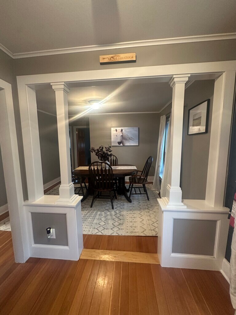 Newly remodeled 2 bedroom, 1 bath 2nd floor downtown Saratoga Springs unit with front porch. Available now through 5/20/26 This apartment is fully furnished/turnkey ready for you to move right in. Wifi, garbage, water/sewer, lawn care, snow removal, furniture, linens dishware all included in rent price. This apartment has lots of Saratoga charm. Great location, walking distance to Saratoga Race track, downtown, Farmers Market, Racing Museum and just steps from East Rec park. Cat/dog friendly with $100 pet fee/month, maximum 2 pets. Brand new washer and dryer all in one unit, hardwood floors throughout. Fully fenced in back yard with table and chairs, grill, fire pit, and is perfect for your four legged friend. Off street parking, extra storage available. Utilities flat $295/month fee. Optional garage space$150/month.