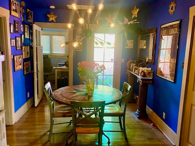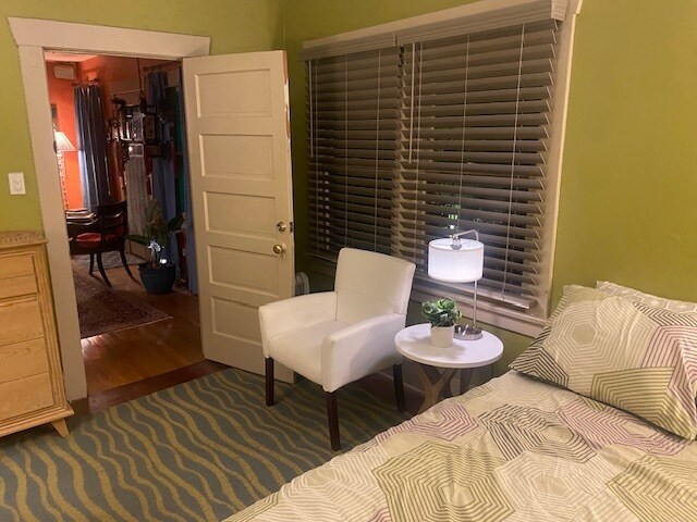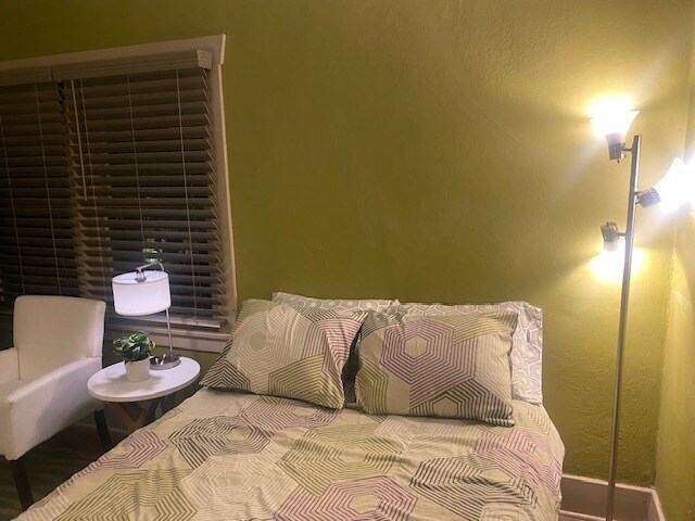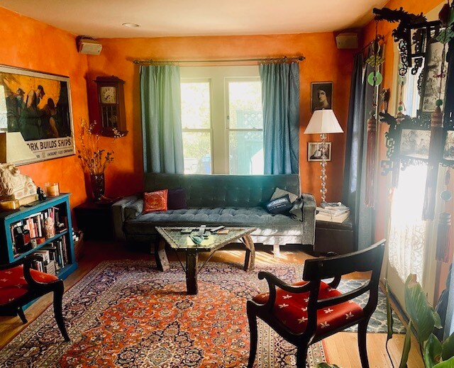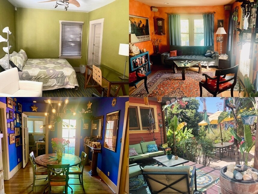 Los Feliz ROOM FOR RENT in a BOHEMIAN BACHELOR BAD--furnished LGBTQ-friendly room in a unique, Secret Garden-type, artsy 1921 cottage-style, 2 bedroom, 1 shared bathroom home with a semi-retired , but youthful homeowner that is only 1 block from Los Feliz Village and Barnsdall Park, 2 blocks from the Metro Redline and less than a 5 min drive to Griffith Park. This cozy cottage-like home has multiple lush outdoor areas and colorful boho decor. Housemate's furnished, medium-sized room is 9' X 13' including a brand new full-sized mattress, a desk with chair, chest of drawers, new room darkening blinds, area rug, white leather club chair and shelved closet with ceiling light (it is the picture with sage green walls in the pictured main photo). Home has energy efficient central air conditioning and heating. This over 100 year-old house has a Hollywood pedigree. It was the former home of a burlesque performer Halo Meadows and her husband "The Amazing Criswell" who film buffs may recall from his appearance in the movie Plan 9 From Outer Space. In fact, the more recent tenant was an industry-known makeup artist named Harry Thomas who helped create the original makeup design for the munchkins in the movie The Wizard Of Oz and later became known for his monster-type makeup design featured in many 1950s and 60s sci-fi and horror flicks. Criswell and Thomas were good friends of filmmaker Ed Wood so his entourage including Vampira and others occasionally socialized at this home.