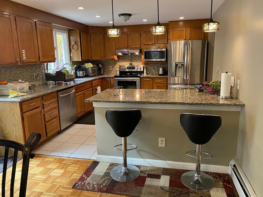 House for Rent Woburn, MA Spacious brick-front raised ranch located in a charming neighborhood. This 4-bedroom, 2-full-bathroom home offers plenty of space and comfort. Main Level: Oak cabinet kitchen with updated appliances, kitchen island seating, and an open layout to the dining room with sliding doors leading to the deck. Oversized living room with hardwood flooring and bay window. Three generous-sized bedrooms and a full bathroom. Lower Level: Large front-to-back family room (can also be used as a master bedroom). Second full bathroom, laundry room, and foyer. One-car garage under the home. Additional features include a new heating system, front and back yards, patio, and yard shed. Conveniently located just 1.4 miles from downtown Woburn and close to restaurants, Walgreens, hardware stores, and more. Lease Details: Tenant pays all utilities, Water bill Included , Landscaping Included . First month's rent, last month's rent, and $2,000 security deposit required. Washer and dryer included. Available from: October 1, 2025