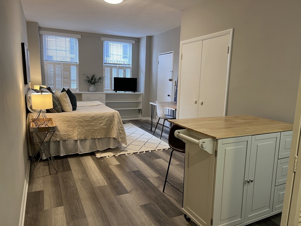 Fully Furnished Studio available November 1, 2025 and is so close to public transportation. Walk score is 98 for this building. This studio has new modern flooring, newly painted, updated bathroom and lots of built-in storage. Kitchen includes an island with seating for 2, refrigerator and microwave, stove/oven, and cooking utensils, pots and pans, dishes, cups, utensils. Queen sized bed with pillows and linens, and towels also included. Shared backyard provides a calm oasis. Perfect location for students or professionals. One block from Peabody, the JHU Homewood-JHMI Peabody shuttle stop, Charm City Circulator stop, the MTA bus stops, across St. Paul Place from Mercy Hospital and steps away from shopping/restaurants and cultural attractions: Walters Art Museum, Center Stage, Washington Monument. Washer/Dryer located conveniently in building.