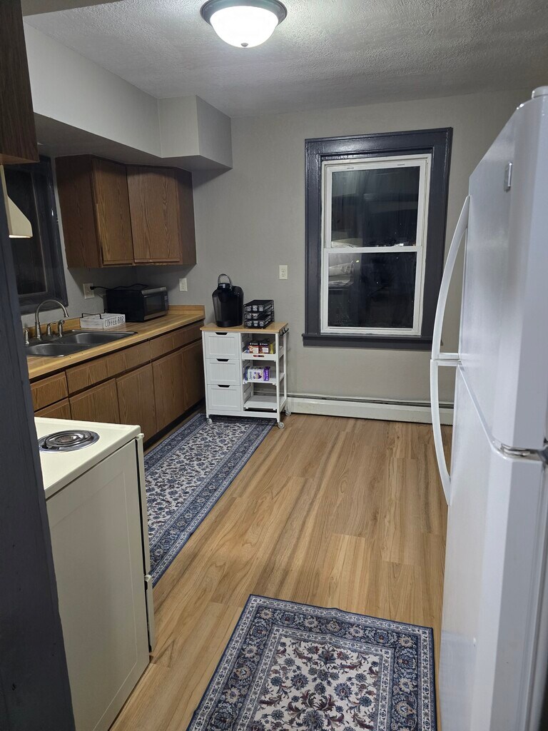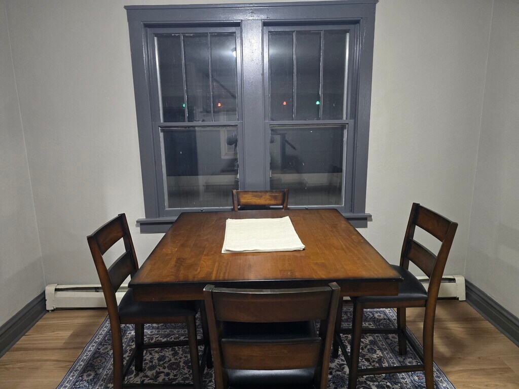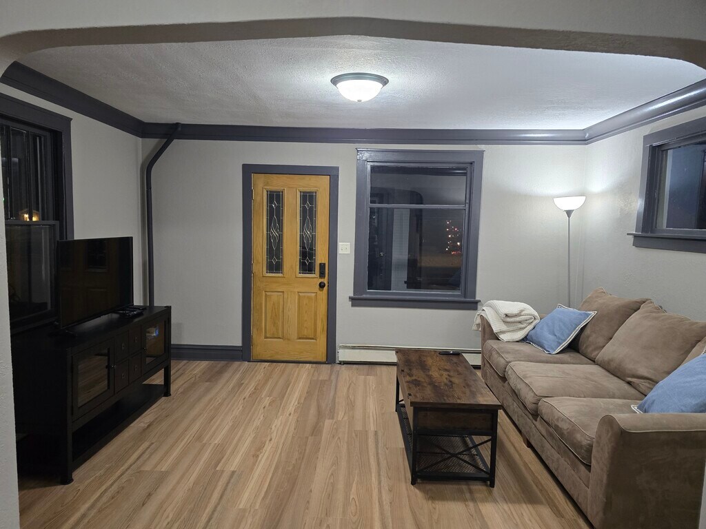 Recently updated from top to bottom, this fully furnished two-bedroom, one-and-a-half-bath home feels fresh and welcoming from the moment you step in. The main floor features new luxury vinyl plank flooring, updated electrical systems throughout, and brand-new paint both inside and out. The living room is warm and inviting, featuring a comfortable sofa, a coffee table, and a smart TV. A dining table for four is situated near the fully equipped kitchen, which includes everything you need to cook at home, along with a cozy coffee bar for your morning brew. The main floor also includes a convenient half bathroom. Upstairs, you'll find two nicely sized bedrooms the first with a queen bed and the second with two full (double) beds along with a full bathroom featuring a single vanity and a tub-shower combo. The basement features a washer and dryer, as well as additional storage space. Outside, enjoy a yard with a fire pit for relaxing evenings with friends or pets, who are welcome here with a deposit and a monthly fee. Additional perks include off-street parking, keyless entry, and a doorbell camera for peace of mind. Whether you're here for work, school, or simply to enjoy everything Superior has to offer, this home provides comfort, convenience, and a great place to unwind at the end of the day.